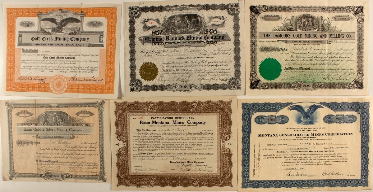Gold Creek 1930, Original Bannack 1916 with unique background for title, Damours Gold 1905, Montana Consolidated 1934, Basin Gold and Silver 1919 early number 60, Basin-Montana 1920 without vignette. (Prag collection) City: State: Montana Date: 1905-1934 ID# 23867