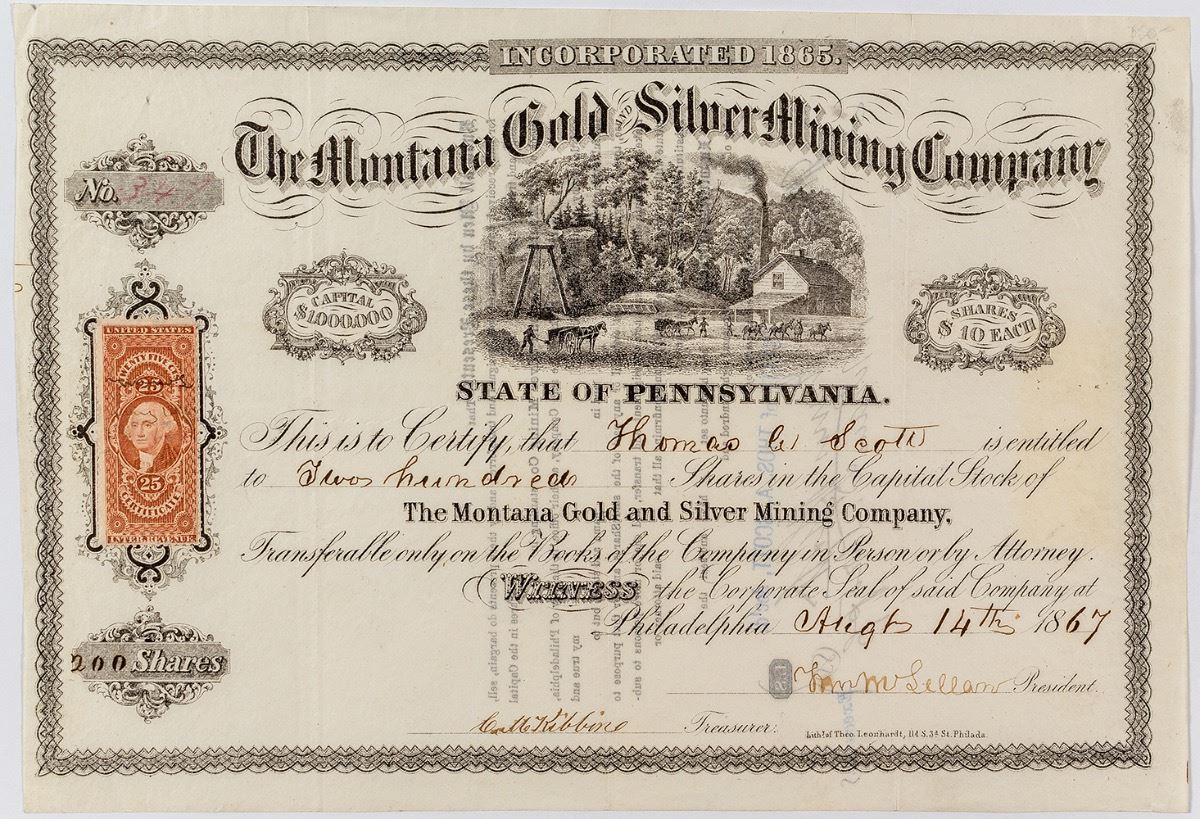 Very early Montana mining! Inc. in 1865 in Pennsylvania. No. 347, issued to Thomas A. Scott for 200 shares on Aug. 14, 1867. Signed by Wm. McLellan as president. Not cancelled. 25 cent adhesive revenue stamp at left. Vignette of mine and mill. Thomas Scott was president of the Pennsylvania Railroad and in charge of government railroads under Lincoln during the Civil War. This mining company built a quartz mill and a one-story residence in Spring Gulch, Summit District in 1866. [Ref: http://deq.mt.gov/abandonedmines/linkdocs/129tech.mcpx] 7" x 10" with folds. City: Summit Mining District State: Montana Date: 1867 ID: 36230