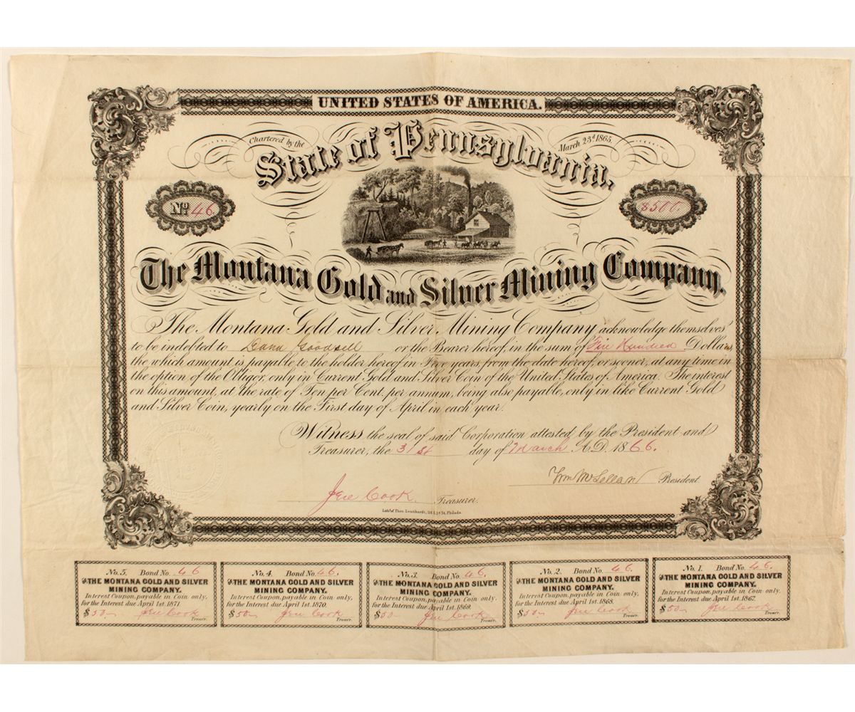 Large, attractive document. Chartered by the state of PA March 23, 1865. Bond No. 46. The company is indebted $500 to Dana Goodsell. Dated March 31st, 1866. Signed by Wm. McLellan (president) and J. Cook (treasurer). Vignette of hoisting works and mill. Measures 16" x 12." Five coupons attached. Folds. The company built a quartz mill and a one-story residence in Spring Gulch, Summit District in 1866. [Ref: http://deq.mt.gov/abandonedmines/linkdocs/129tech.mcpx] Prag Collection