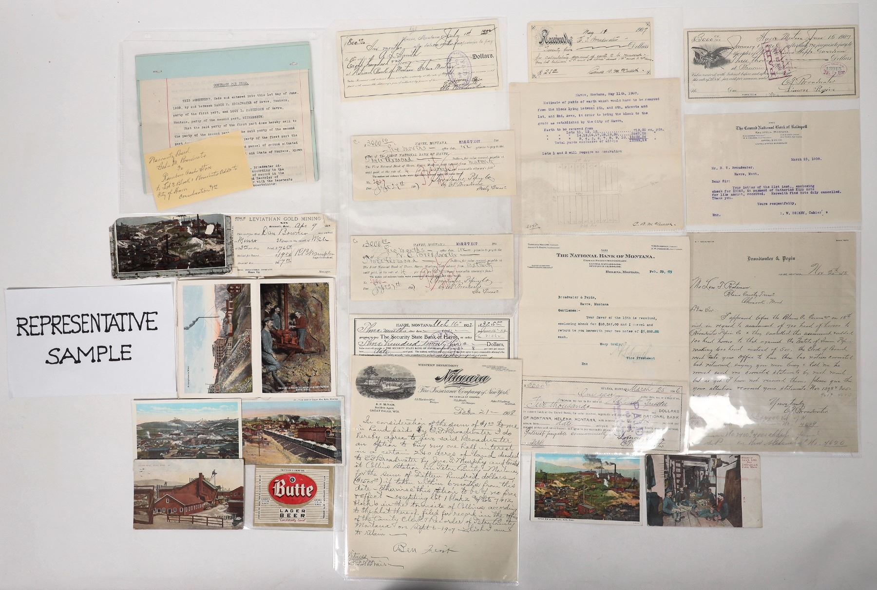 A grab bag group of Montana ephemera, c1899-1947. Approximately 30 items, including postcards, a Leviathan Gold Mining miner's receipt (1899), many bank notes, letterheads, and a warranty deed.