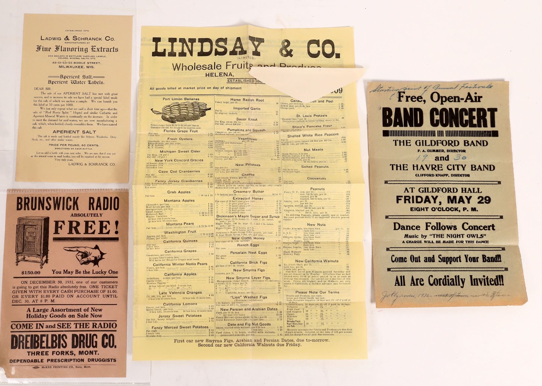 4 Montana handbills. Brunswick radio-lower left chip, Lindsay fruit-1" tear and stuck envelope flap, 1930's concert with pen writing, Ladwig & Schranck. Montana