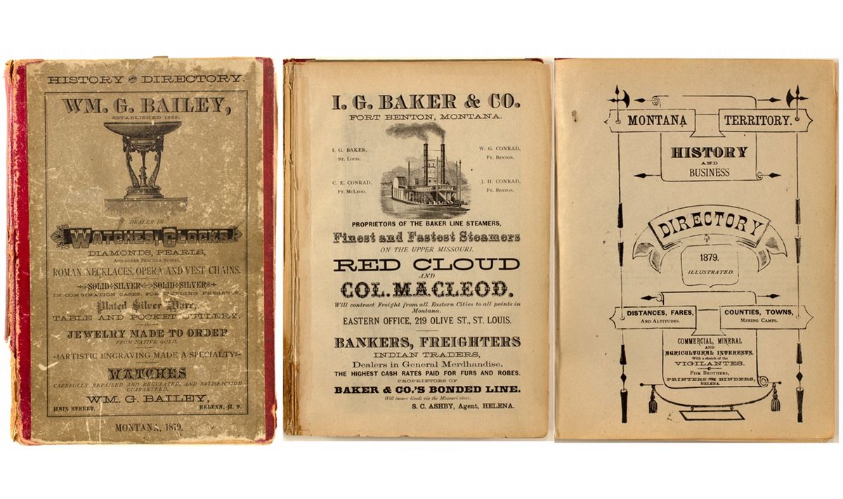 “Montana Territory History and Business Directory 1879. Illustrated. Commercial Mineral and Agricultural Interests. With a Sketch of the VIGILANTES. Fisk brothers, printers and binders, Helena.” Copyright by Frank W. Warner, 1879, hardcover, 218 pages. Includes Table of Contents, illustrations, and multiple advertisements. Directory presented county by county. Also includes map with a 60 mile and 120 mile limit surrounding Helena. Owners name written on inside of front and back cover. Front lower cover separating from spine.