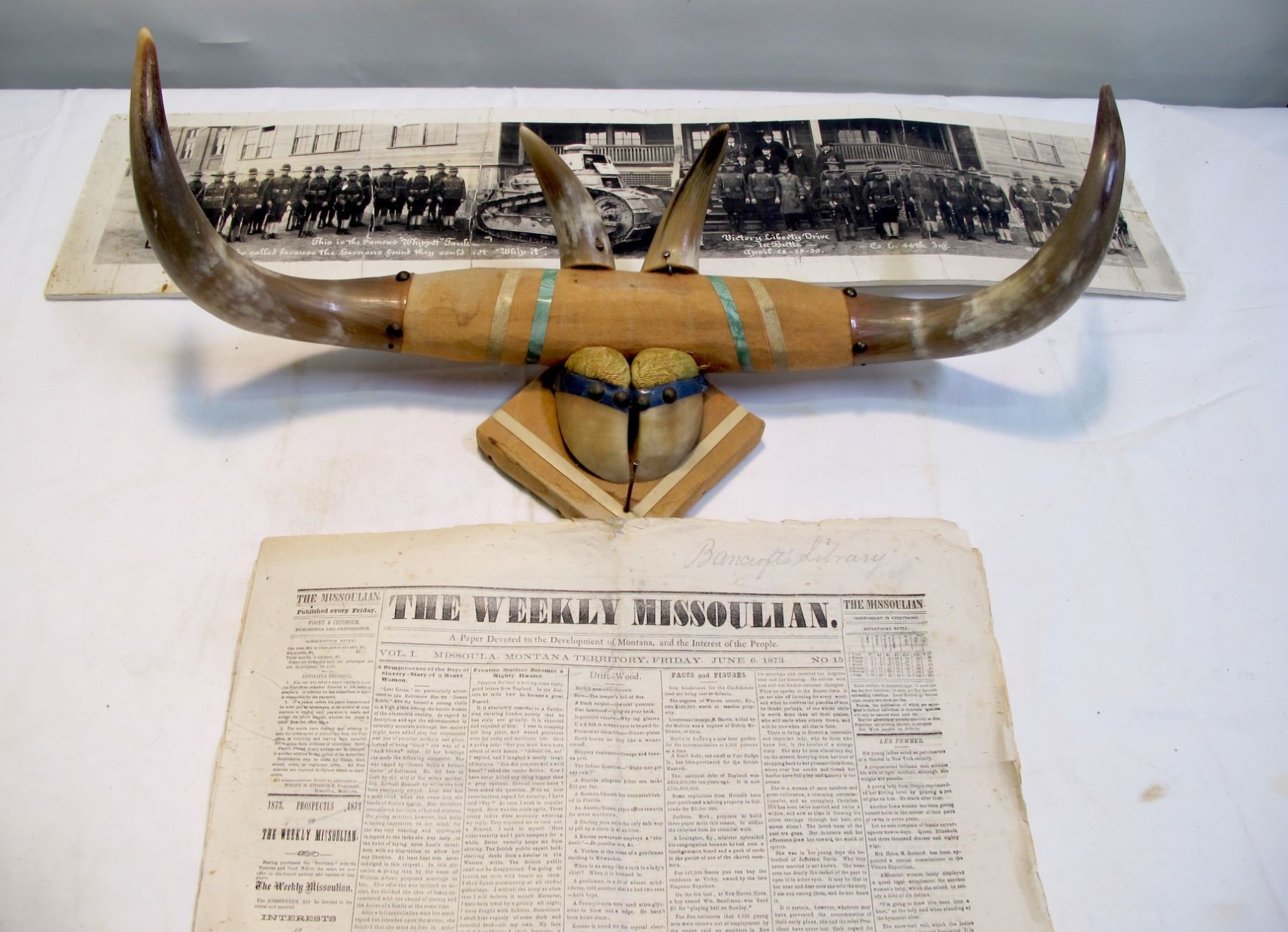 Early issue of the Weekly Missoulian, vol 1, #15, June 6, 1873. Mounted panorama "Victory Liberty Drive in Butte, April 28-30, c1918, about 36" long, complete but with damage (photo by Miller, Butter); wall mount horns for hat and coat rack, classic Montana office piece, perhaps from the 1920's, about 24" long, small horns- not the huge horns.