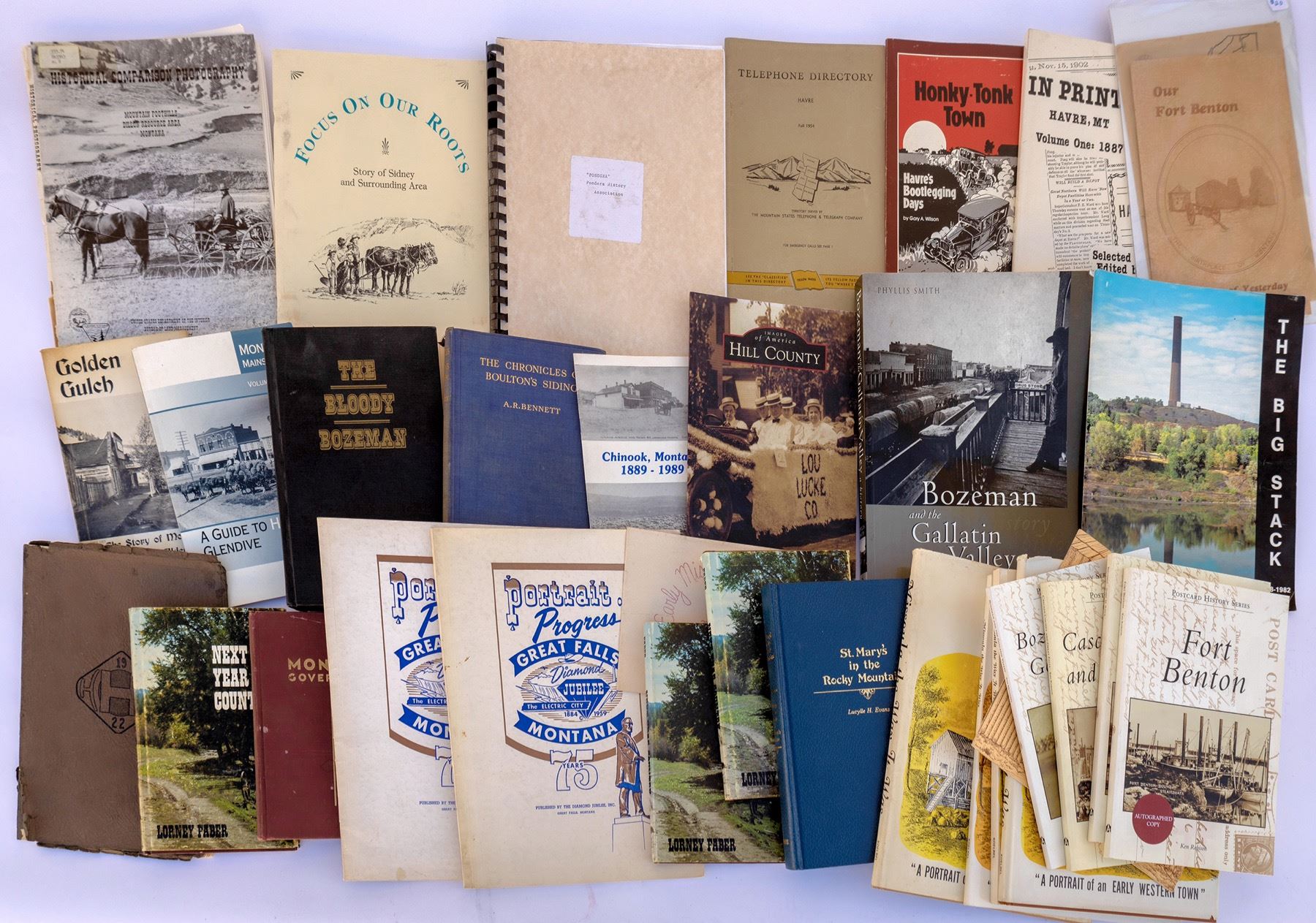 Postcard History Series- Bozeman and the Gallatin Valley, Cascade County and Great Falls, Billings, Fort Benton. 4x Missoula the Way It Was by Koebel. 3x Next Year Country by Faber. St. Mary's in the Rocky Mountains by Evans, 2x Portraits of Progress-Great Falls 1959, Bozeman and the Gallatin Valley by Smith, The Bloody Bozeman by Johnson, The Chronicles of Boulton's Siding by Bennett, Golden Gulch by Pace, Hill Country by Mayer, Guide to Historic Glendive, Honky Tonk Town by Wilson, Havre telephone directory 1954, and more. State:Montana City: Date: Provenance: Stuart Mackenzie Montana Ephemera Collection