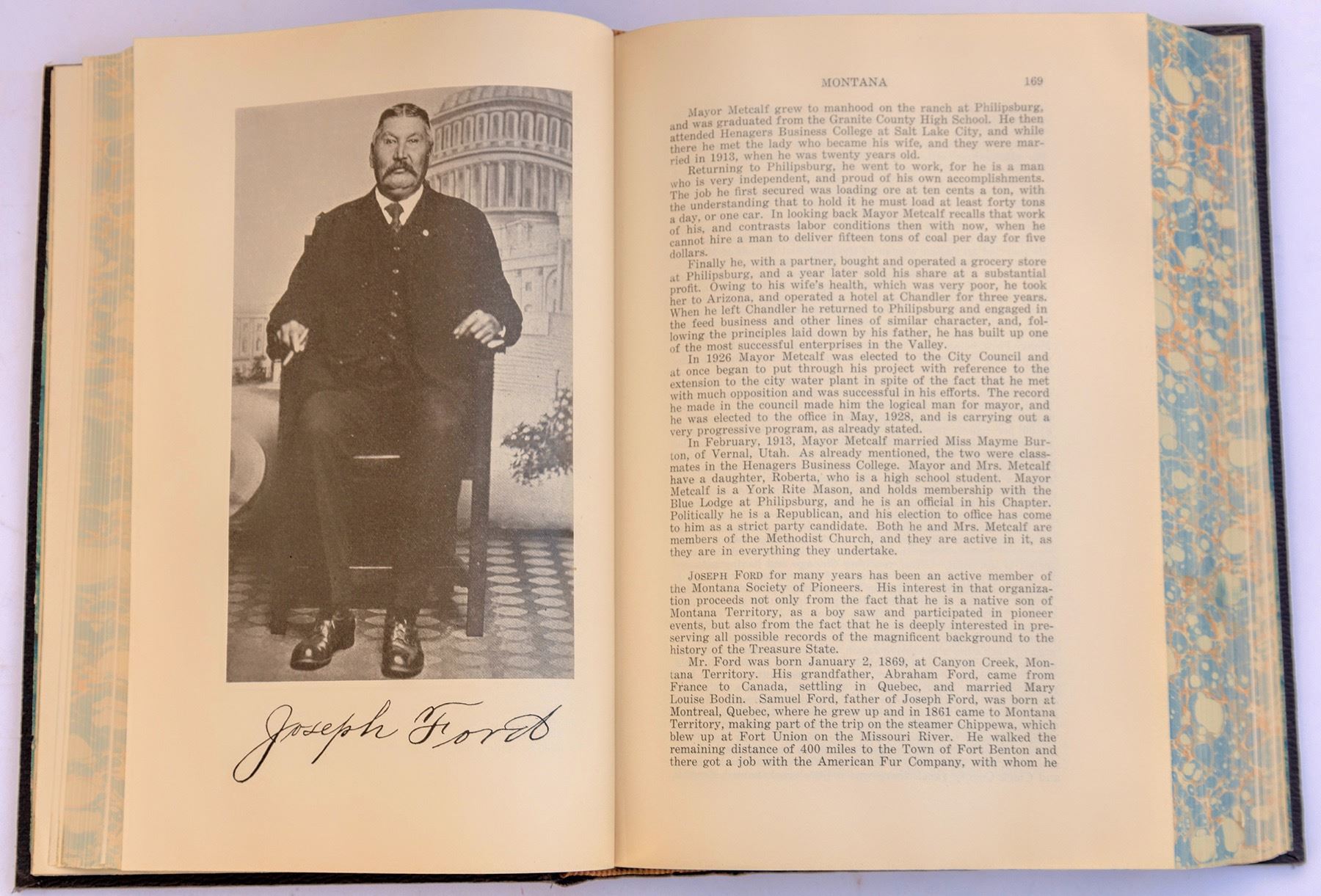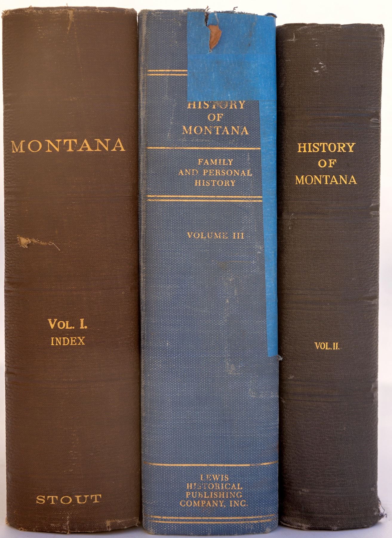 3 hardcovers. 1957 History of Montana, Family and Personal History Vol III-biographies on notable Montanans, binding is taped. 1930 History of Montana Vol II-biographies on notable Montanans. 1921 Montana Vol. 1, Its Story and Biography by Stout, with index. State:Montana City: Date: Provenance: Stuart Mackenzie Montana Ephemera Collection