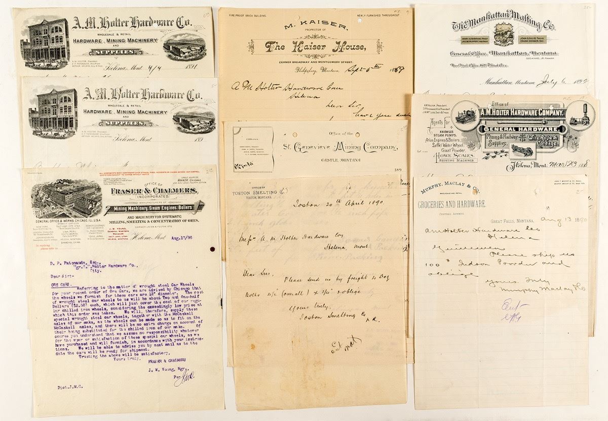 Lot of nine. Many illustrated. Includes: The Manhattan Malting Co. (Manhattan, MT, 1892, illustrated), A.M. Holter Hardware Co. (three total, two different, Helena, MT, 1888-1891, illustrated), Murphy, Maclay & Co. (Great Falls, MT, 1890), Toston Smelting Co. (Toston, MT, 1890), M. Kaiser (Prop. of The Kaiser House, Philipsburg, MT, 1889), St. Genevieve Mining Co. (Castle, MT, 1891), and Fraser & Chalmers Mining Machinery (Helena, MT, 1896, illustrated). Folds and light soiling on most. (Prag Collection) City: State: Montana Date: 1880s and 1890s HWAC# 30914