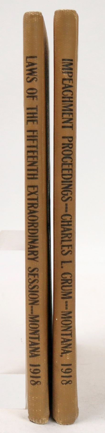 1918 Proceedings of the Court for the Trial of Impeachments against Charles L Crum. "District Judge Charles L. Crum of Montana, whose strict adherence to constitutional principles and voicing of nonconformist views during World War I were perceived as pro-German and anti-patriotic, was impeached and removed from office in 1918. In 1991, the Montana Senate approved a resolution exonerating him.' from apnews.com. 1918 Laws, Resolutions and Memorials of the State of Montana, 15 legislative assembly.