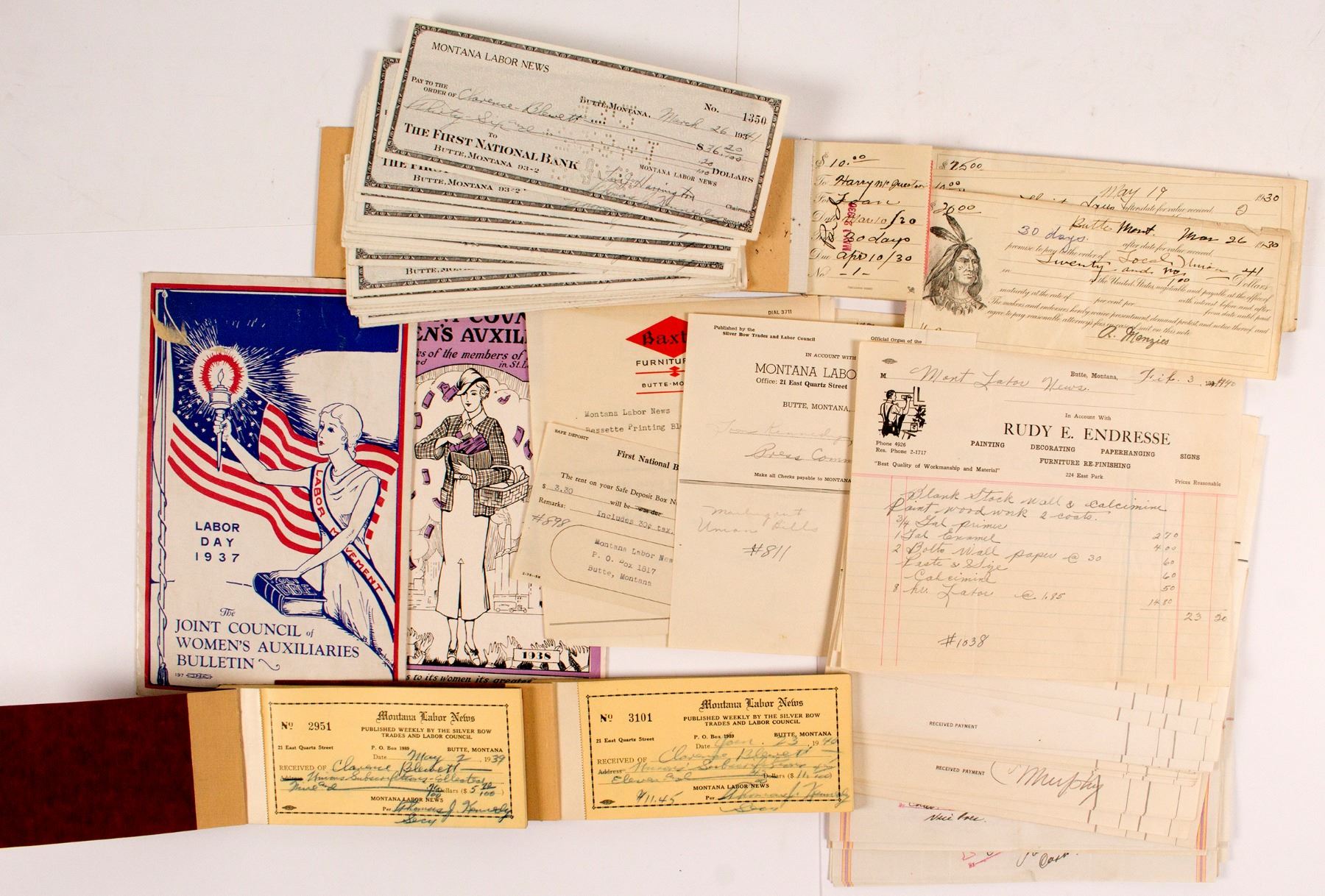 Approx 30 Montana Labor News cancelled check c. 1940, Approx 30 receipts from Bessette Printing Company to Montana Labor News c. 1940. Approx 30 varied receipts for items sold to Montana Labor News c. 1940. Receipt book c. 1930's with some detached receipts with the head of an Indian and many blank receipts. 2 small Montana Labor News receipt books from 1939-1940. 2 different copies of The Joint Council of Women's Auxiliares, c. 1937.