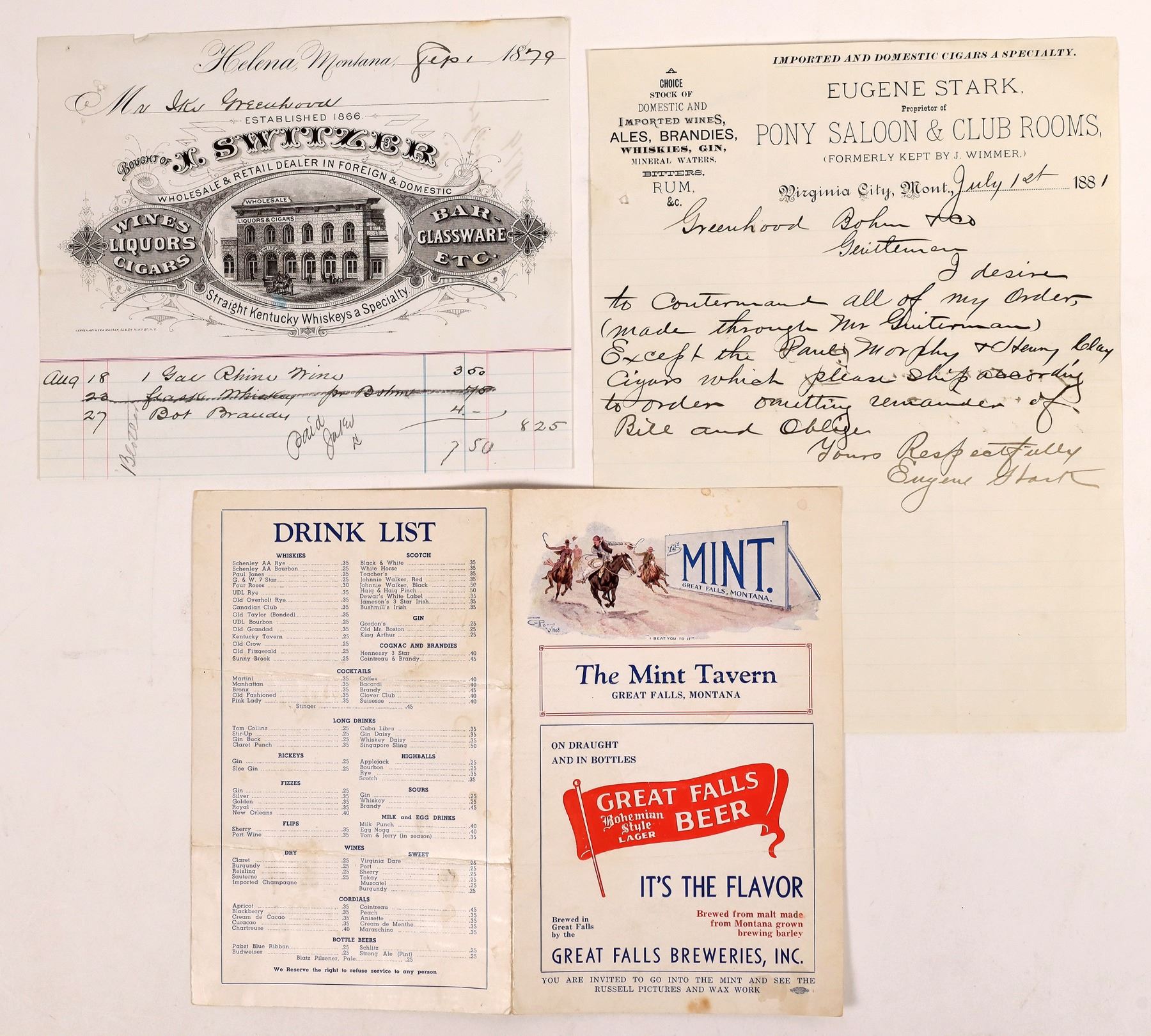 The Mint Tavern menu, Great Falls, list Cocoa Cola as a drink, 8x5" with 2 horizontal folds. J Switzer 1879 pictorial billhead. Eugene Stark, Pony Saloon 1881 letterhead regarding a cigar order.