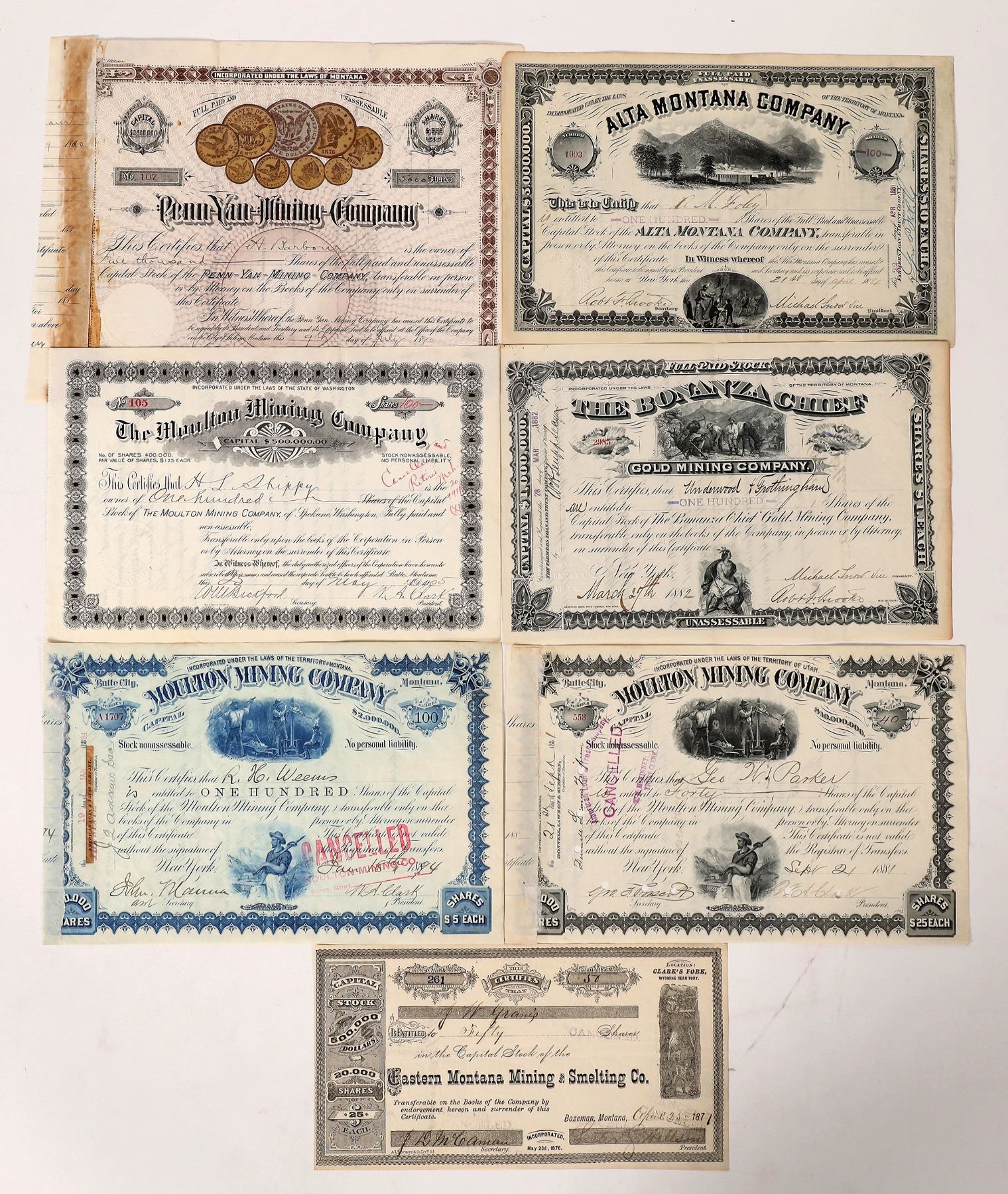 1) Eastern Montana Mining & Smelting Company stock certificate No. 261 issued to J.W. Granis for 50 shares on April 25, 1877 in Bozeman, Montana. Signed by president Lester Wilson and secretary J.D. McCamam. Not cancelled. Location: Clark's Fork, Wyoming Territory. Black border and print, small mine hoisting vignette. Printed by A.L. Bancroft & Co, SF. Pinholes. 5.25x10".