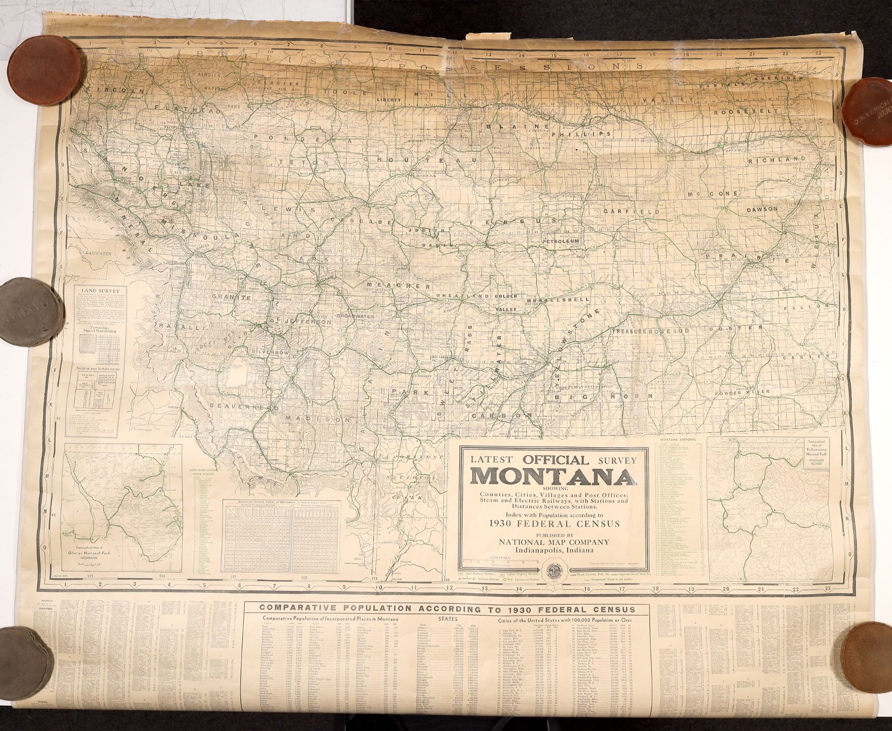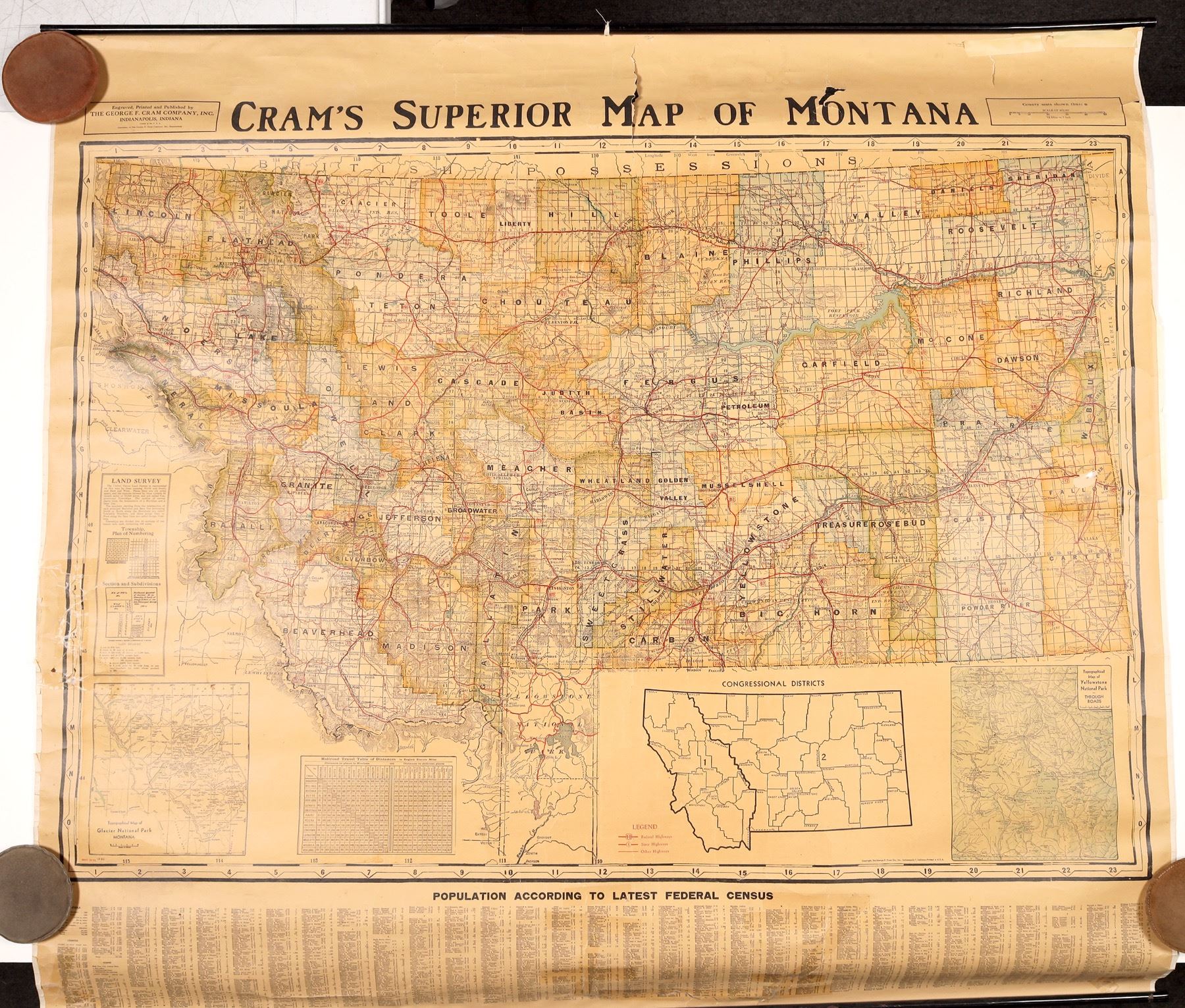 2 Montana maps by Cram. Superior Map of Montana c. 1910, 45x50", tape repairs and tears. c. 1930 color Latest Official Survey Montana, 44x49", some edge chips and small tears. Please inspect.