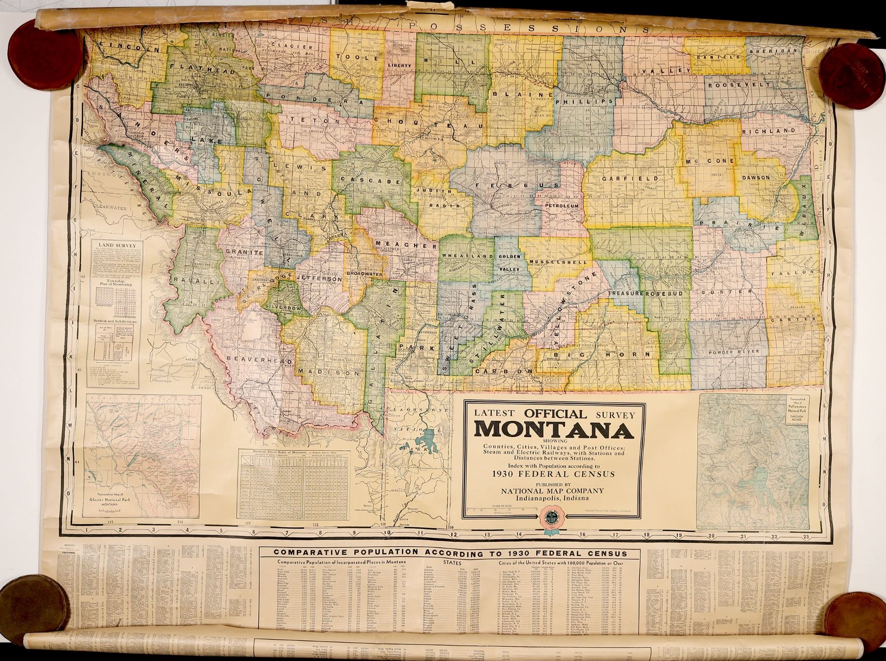 2 Montana maps by Cram. Superior Map of Montana c. 1910, 45x50", tape repairs and tears. c. 1930 color Latest Official Survey Montana, 44x49", some edge chips and small tears. Please inspect. Montana Stuart Mackenzie Montana Ephemera Collection
