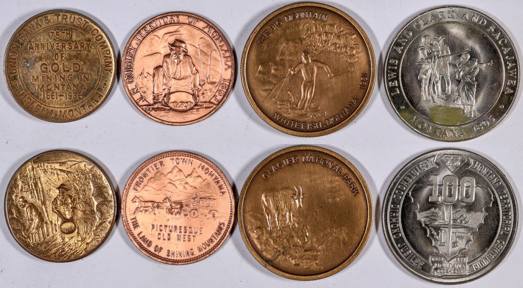 Lot of four: 1) 1964 Montana Territorial Centennial: Lewis & Clark; 2) 1981 The Big Mountain, Whitefish; 3) J. R. Quigley Territory of Montana; 4) 1936 75th Anniversary of gold mining, Union Bank & Trust.
