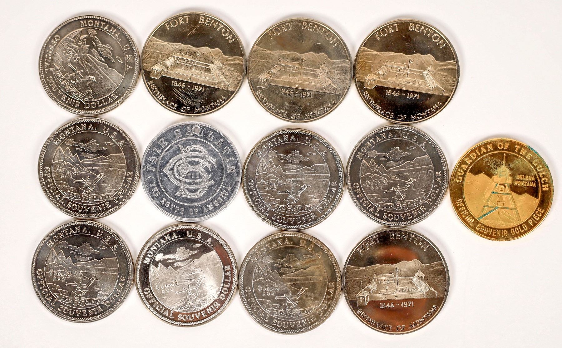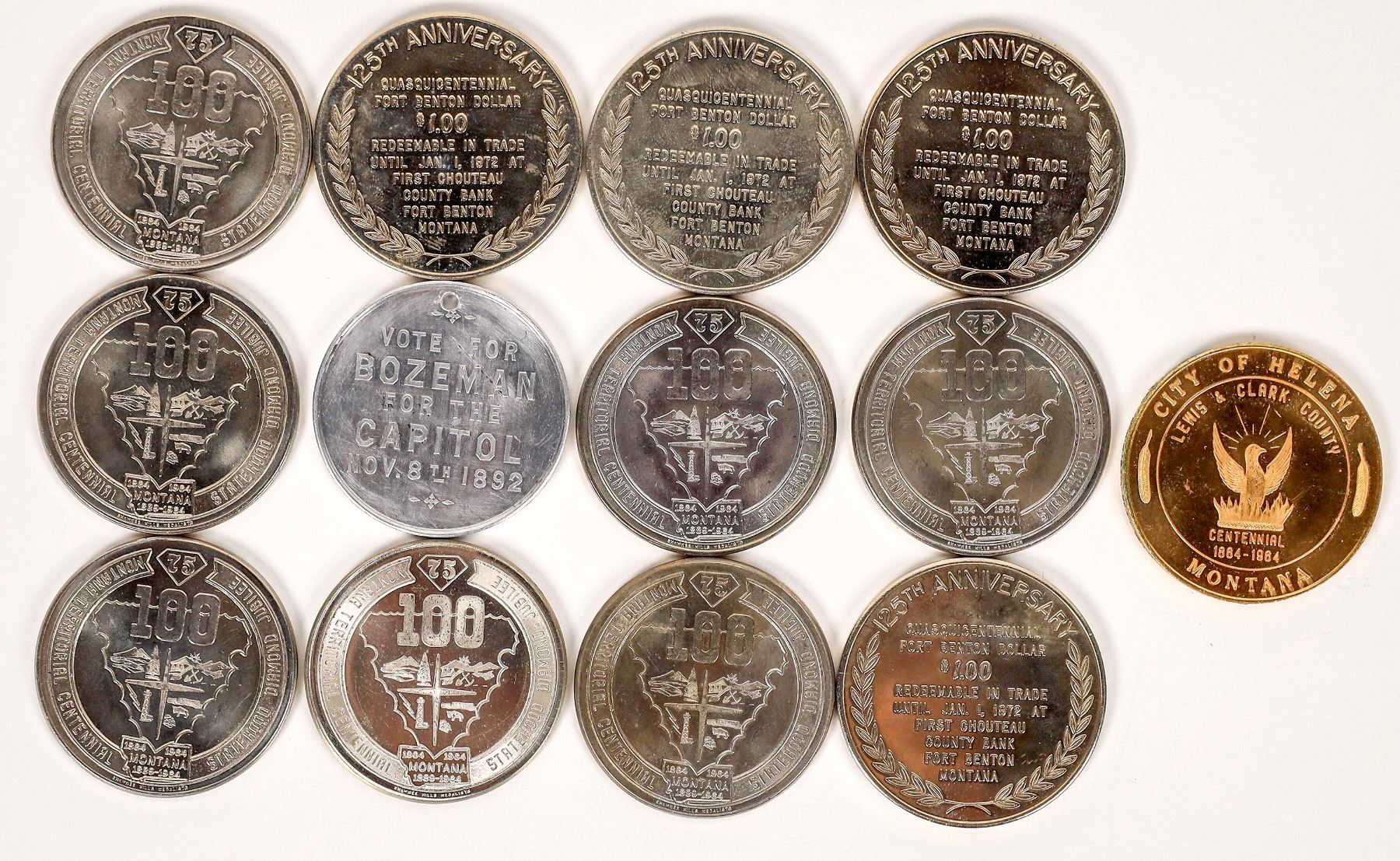 Lot of 14 medals from Big Sky Country: Helena: Guardian of the Gulch; Vote for Bozeman State Capitol 1892; 1964 Statehood Diamond Jubilee official souvenir dollar (8); 1971 Fort Benton Birthplace of Montana (4). Montana
