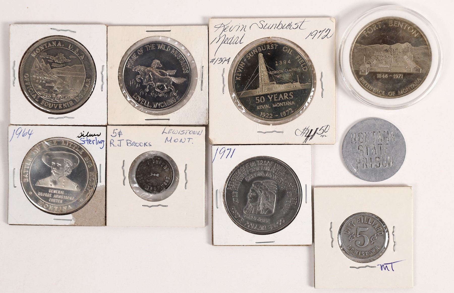 Lot of nine: 1964 Montana Territorial Centennial, silver, 38 mm; 1971 Fort Benton 125th Anniversary; 1971 Hardin, Montana trade dollar; 1972 Kevin, Montana 50th anniversary; Montana State Prison one dollar token; R. J. Brooks, GF 5c, Lewistown; 1968 Pryor Montana wild horses; 1964 souvenir dollar; City Billiard, GF 5c Lewistown.