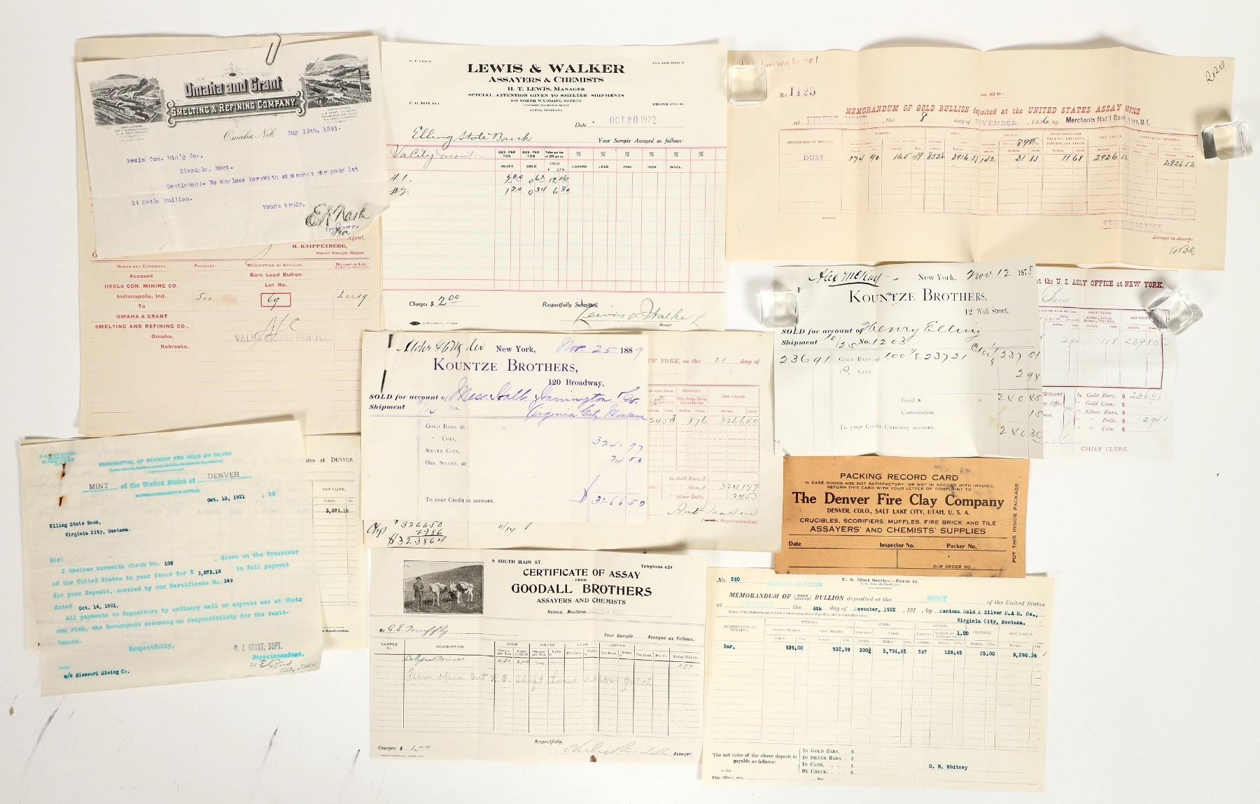 Lot of 10. Gold Bullion Deposit slips, Goodall Bros Cert of Assy., Lewis and Walker Assayers, Montana Gold and Silver Mining Co. Bullion deposit Missouri Mining Co, Union Pacific Railway bill of lading Omaha & Grant Smelter shipment. Hecla Lead Bullion Shipments @ $42,00 ea.