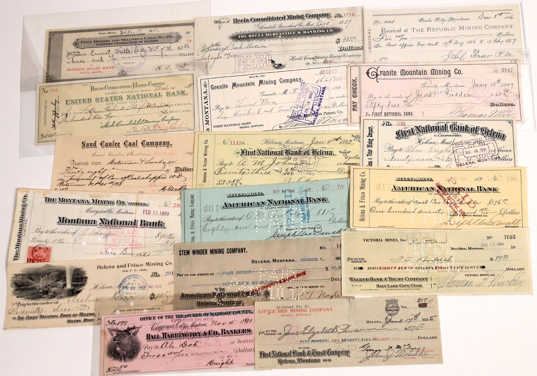 Lot of 17 Montana mining checks, mostly 1880s-1890s,(territorial); a few early 20th century. State:Montana City: Date: Provenance: Stuart Mackenzie Montana Ephemera Collection