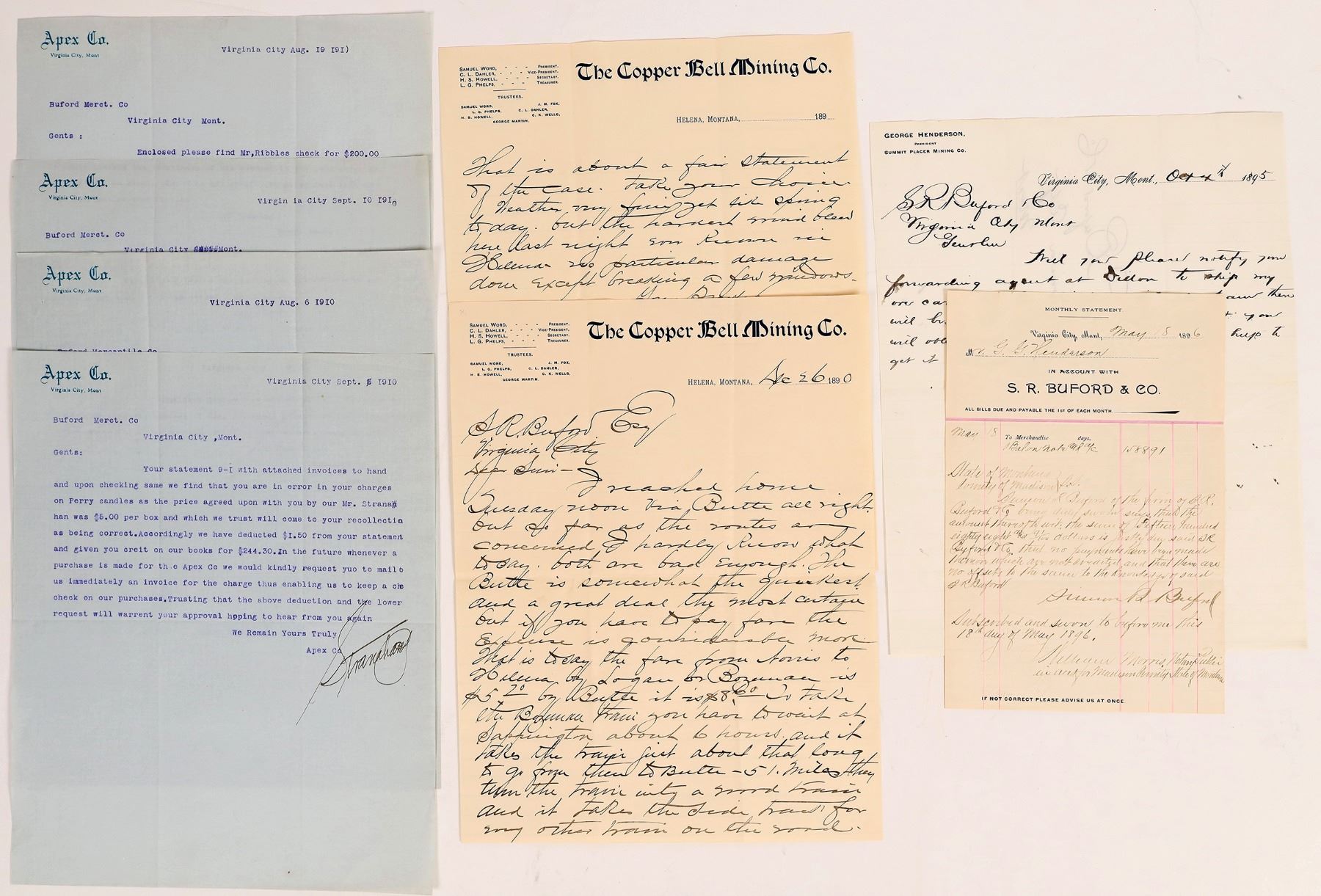 1895 Summit Placer Mining letter to SR Buford wit attachment. 1890 Copper Bell Mining 2pp letter to SR Buford. 1910 Apex Co. 2pp of letters to SR Buford. Montana