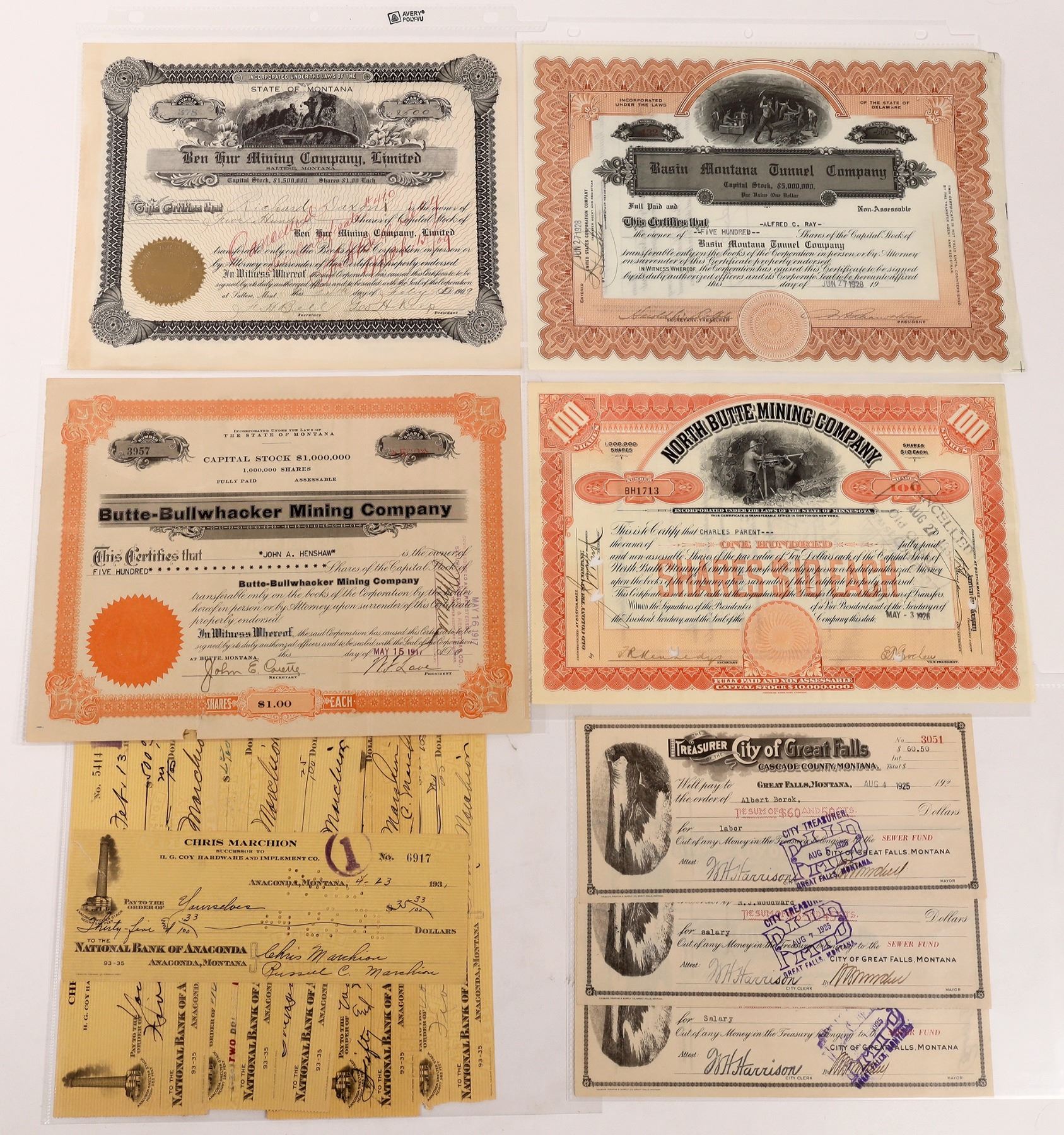 Lot of six. 1) Ben Hur Mining, Limited. Saltese, Montana. 1909. #378. Owned 5 claims adjoining the Last Chance Mine. Produced lead, copper and silver. Only three miles from the railroads that made transportation easy! 2) Butte-Bullwhacker. 1911. #3957. 3) Basin Montana Tunnel. 1928. #432. Jefferson County, High Ore Mining District. Located near the towns of Basin, Boulder and Comet. Did placer and lode ore mining. 4) North Butte. 1926. #BH1713. 5) City of Great Falls sewer fund checks. Signed by mayor. 6) Six Chris Marchion hardware and implements checks. Great vignette of the Anaconda Smelter Stack; Height 585 feet.