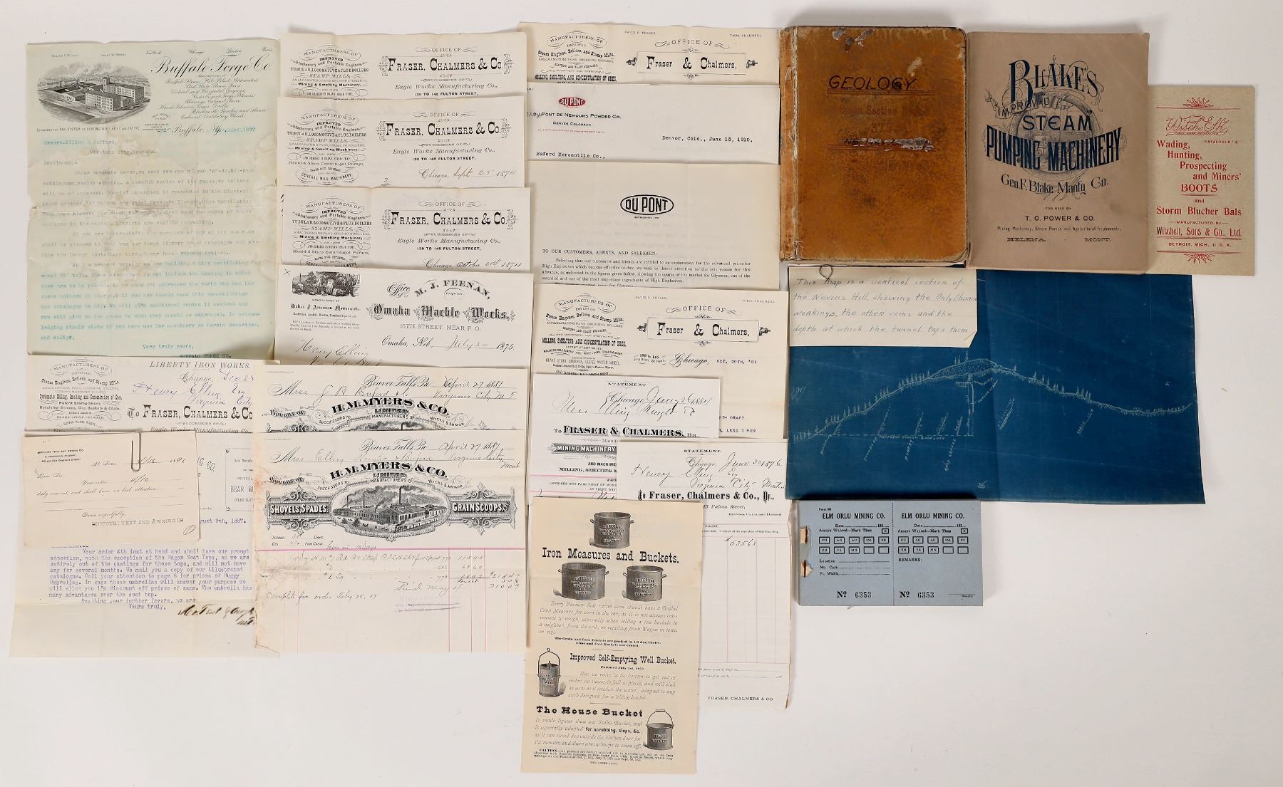About 24 pieces of Montana mining ephemera. Elmu Orling Mining c. 1920's cards in a book. Geology book with hand drawn maps from NB Mining, an unknown major mine probably in MT. Several letterheads with some pictorials, mining equipment catalog etc. c. 1874-97. Montana