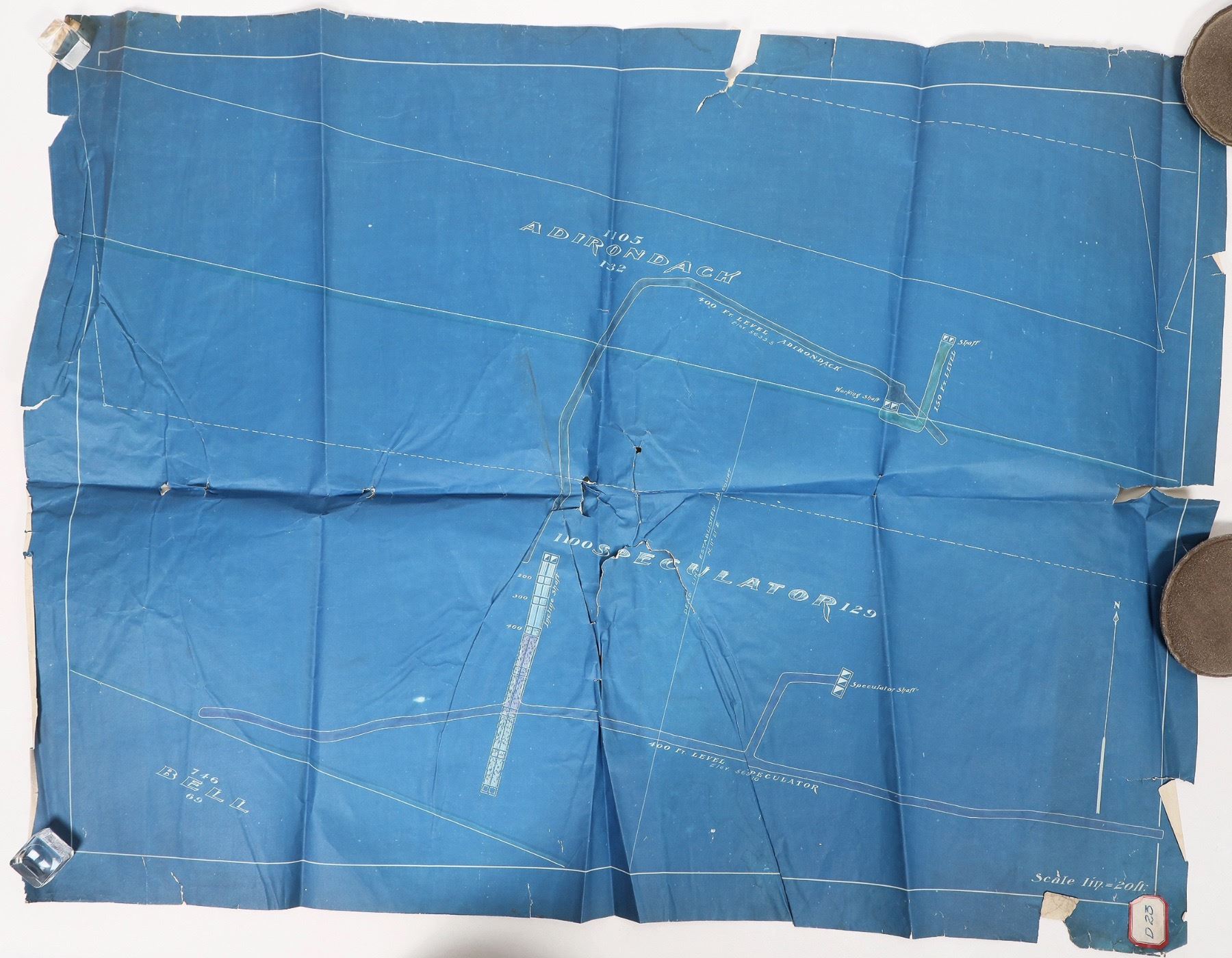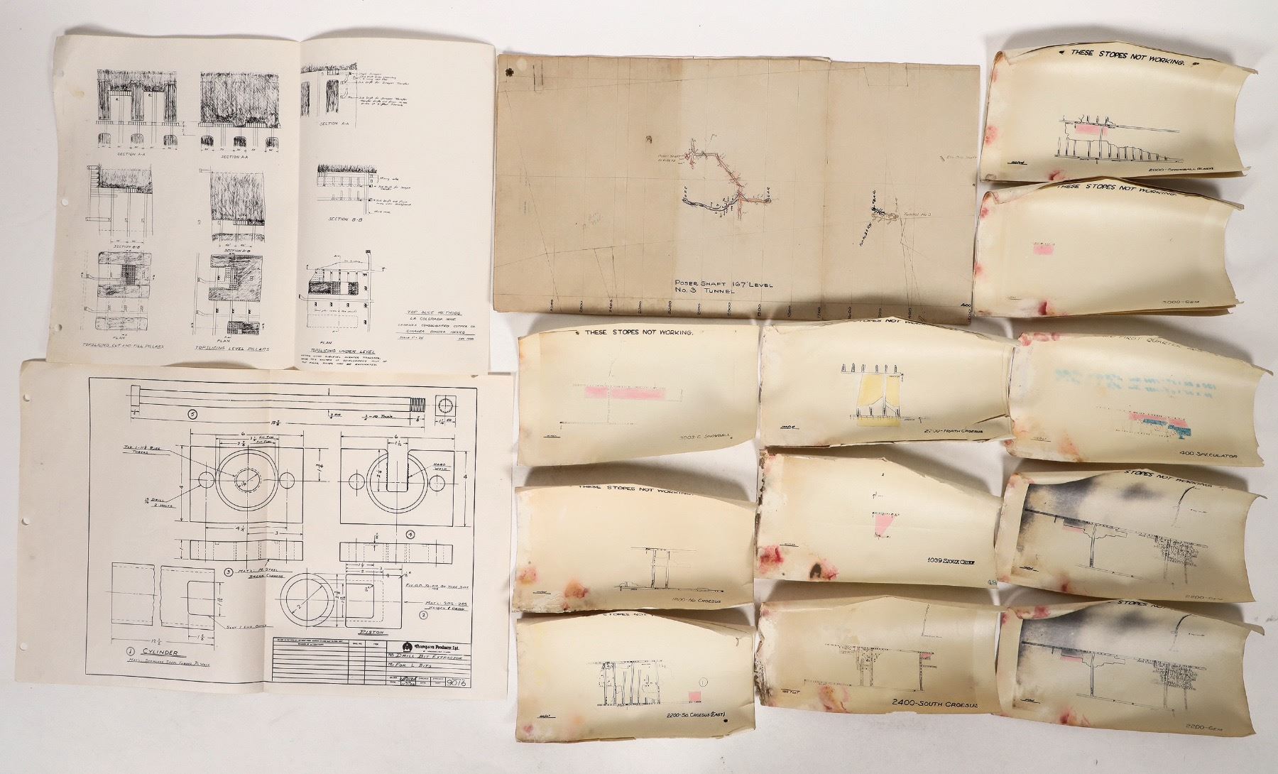 Blue print maps-2x Speculator plus 1 unidentified, near Butte-several tears and stains,1925 small Lamonta, Poser Shaft, drill bit extractor and top splice methods drawings, several stopes not working drawings-curled, 2x Tamarack & Custer Mining 1918 pay stubs.