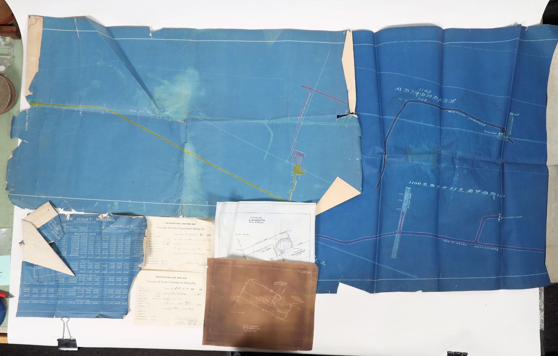 Blue print maps-2x Speculator plus 1 unidentified, near Butte-several tears and stains,1925 small Lamonta, Poser Shaft, drill bit extractor and top splice methods drawings, several stopes not working drawings-curled, 2x Tamarack & Custer Mining 1918 pay stubs.