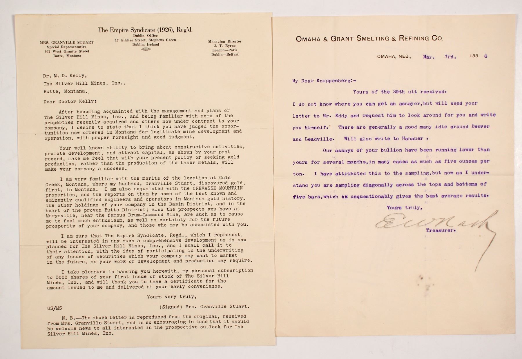 Lot of two. 1) 1886 letter from Omaha & Grant Smelting & Refining Co. to Henry Knippenberg, who was the general manager of the Hecla Mining Co. in Glendale, Montana. The letter is about assaying: "I do not know where you can get an assayer...There are generally a good many idle around Denver and Leadville." "Our assays of your bullion have been running lower than yours for several months, in many cases as much as five ounces per ton. I have attributed this to sampling..." 2) Interesting reproduction letter from Mrs. Granville Stuart that serves as a promotional piece for the Silver Hills Mine company in Butte. Granville Stuart, known as "Mr. Montana," was a pioneer, gold prospector, businessman, civic leader, vigilante, author, cattleman and diplomat who played an important ole in the early history of Montana Territory and the state of Montana.
