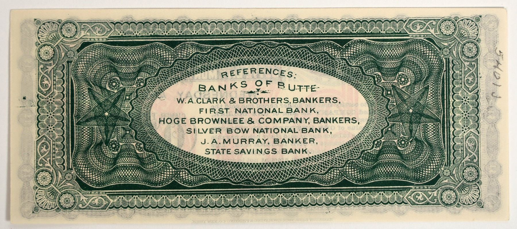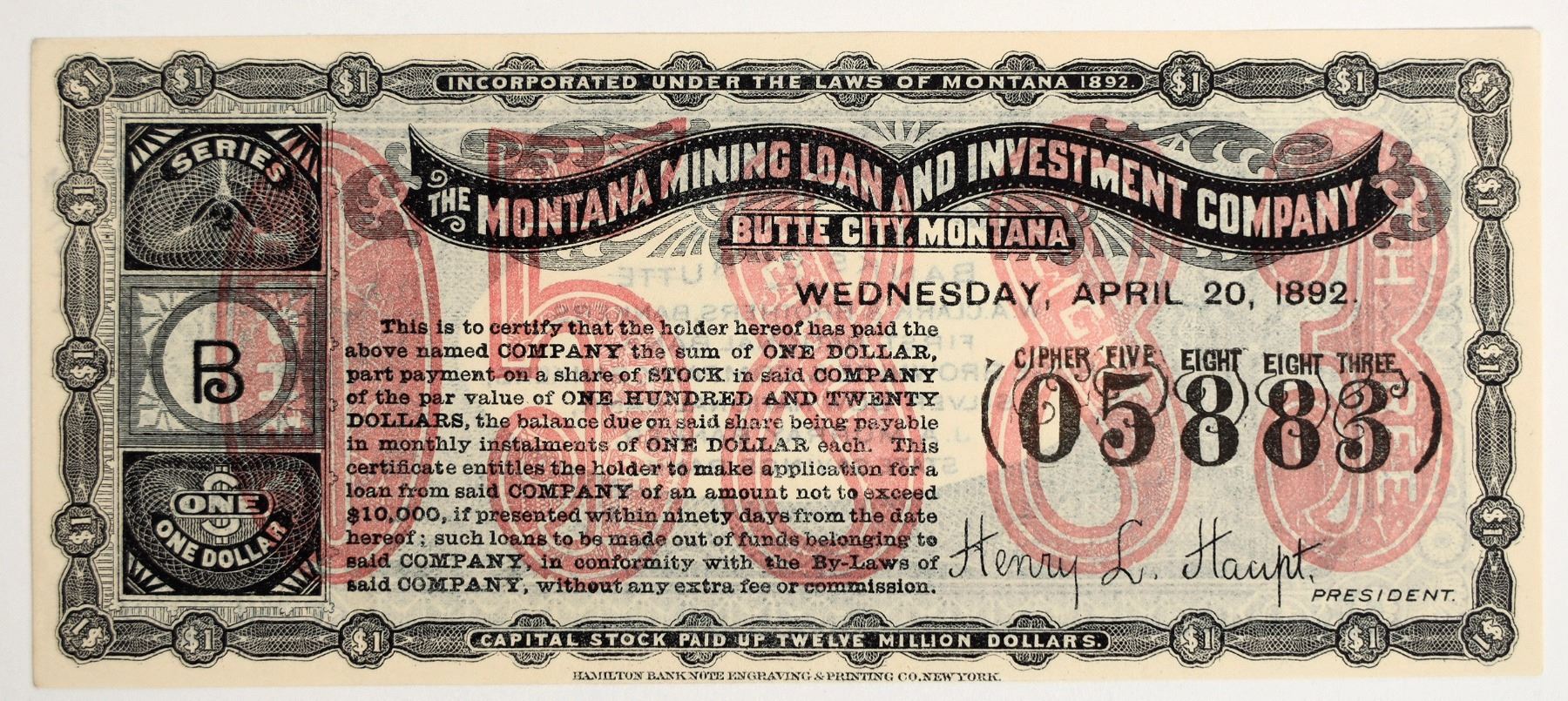This is an almost uncirculated subscription certificate based in Butte City. Henry L. Haupt as president. This turned out to be a major mining scheme. Haupt was even brought to trial in 1895. Printed by Hamilton Bank Note Engraving & Printing Co., New York. 2.5 x 6"