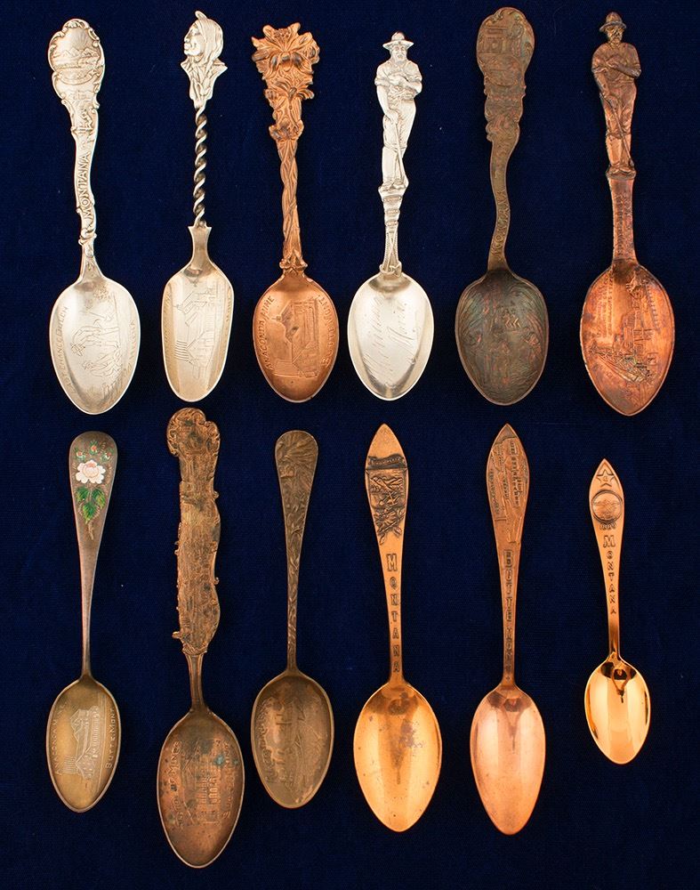 Attractive collection of 4 silver; 8 copper spoons. 6 of these spoons are die struck, 3 are engraved. 4 are from Butte, 1 from Sheridan, 3 Anaconda & 1 from Last Chance Gulch. Largest spoon is 6.25"; smallest 4.25". Date: Location: Montana HWAC# 56712