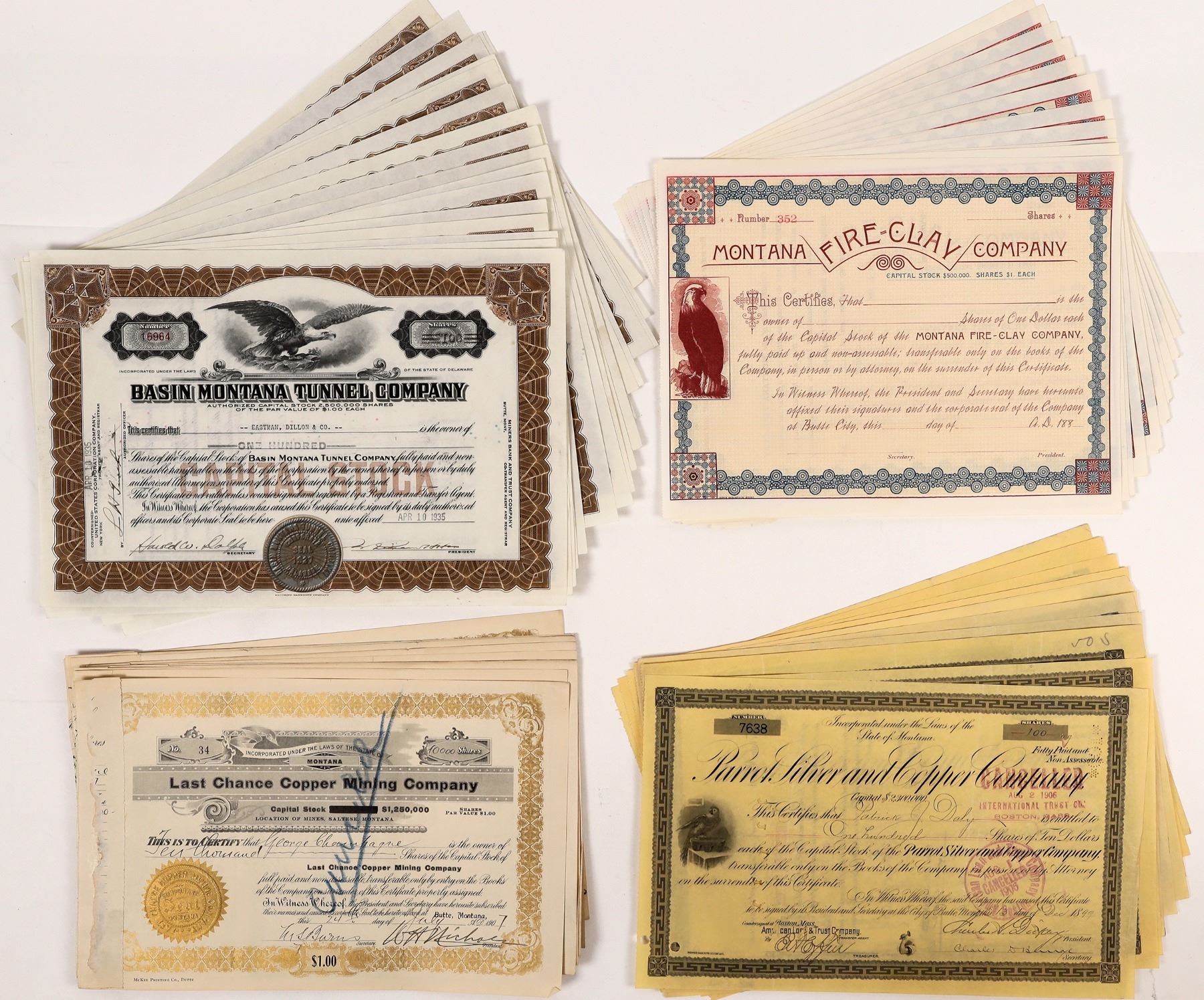 Lot of 50+. Parrot Silver & Copper Co. (12 stocks, 1897-1906); Basin Montana Tunnel Company (22 stocks, 1935); Last Chance Copper Mining Company (11 stocks, 1907-08); and Montana Fire-Clay Company (11 unissued stocks, 1880s).
