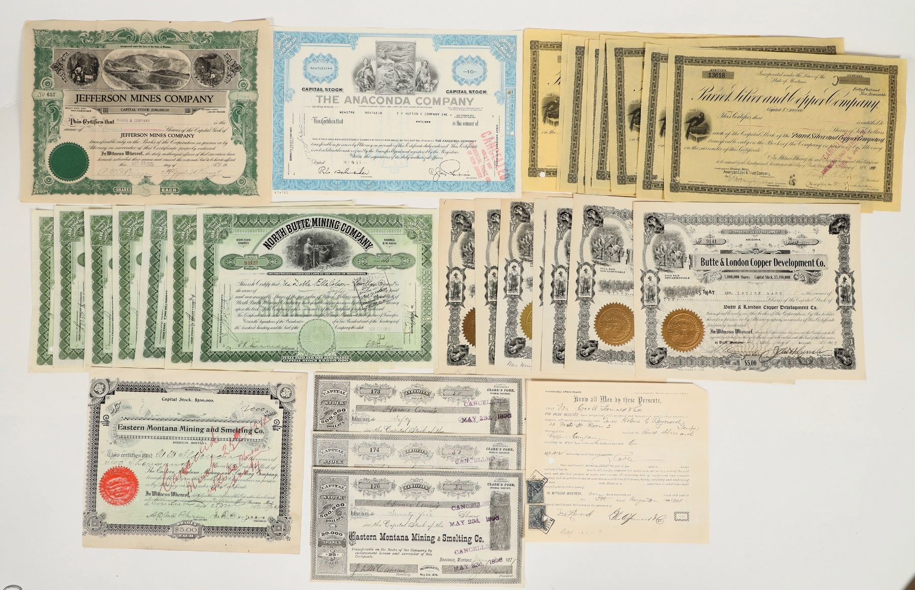Lot of 32. Issued 1877-1967, I/C, I/U. Eastern Montana Mining and Smelting, Butte & London Copper Development Co, North Butte Mining Co., Parrot Silver and Copper Co. , The Anaconda Co. Jefferson Mines Co.. Some w/revenue stamps. Printers : American BNC, Western BNC, Goes, A.L. Bancroft & Co. McKee Printing Co.,