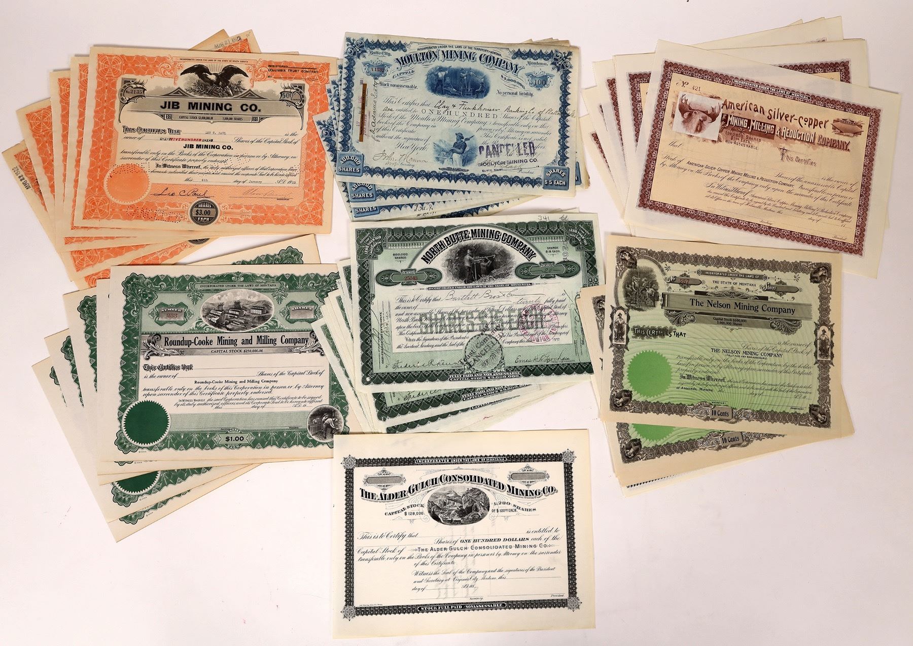 Lot of 45. 1) Moulton Mining Company. Five stocks, issued 1891-95, all signed by WA Clark as president (stamp cancelled). Clark, one of the "Copper Kings" of Montana (mining millionaires), was also a US Senator from Montana (1901-07). 2) JIB Mining Company. Five stocks issued 1922-23, punch cancelled. 3) Home Stake Gold Mining Company, Ltd. (Not to be confused with the famous South Dakota mine). Four unissued stocks, dateline Helena, 1800s. 4) Nelson Mining Company. Five unissued stocks, Anaconda. 5) North Butte Mining Company. 10 stocks issued 1907-1916. Green border, black print, and mine drilling vignette. 6) Alder Gulch Consolidated Mining Company. Unissued. Virginia City, 1880s. 7) Roundup-Cooke Mining & Milling Co. 5 unissued stocks. Mining vignettes. 8) American Silver-Copper Mining, Milling & Reduction Company. 10 attractive unissued stocks, Helmville, 1800s.