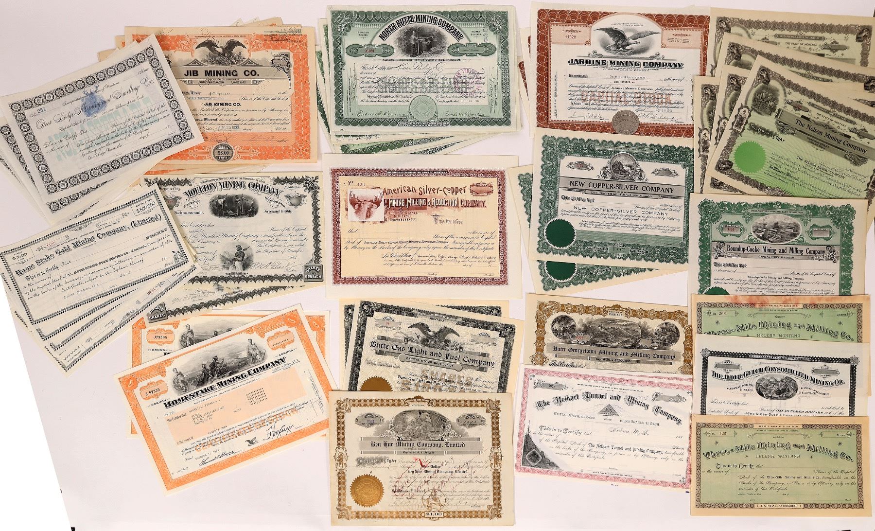 Lot of 60+. 1) Moulton Mining Company. Two 1880s stocks signed by WA Clark as president (punch cancelled). Clark, one of the "Copper Kings" of Montana (mining millionaires), was also a US Senator from Montana (1901-07). 2) Ben Hur Mining Company, Ltd. Saltese, MT. Issued in 1910, pen cancelled. 3) North Butte Mining Company. 20 stocks, issued 1907-23, mine drilling vignette. 4) Basin Montana Tunnel Company. Three stocks issued in the 1930s. 5) JIB Mining Company. Five stocks issued in the 1920s. 6) Jardine Mining Company. Three stocks issued in the 1940s. 7) Homestake Mining Company. Two stocks issued in the 1980s, plus 5 unissued stocks from the 1880s. 8) Unissued stocks: Butte Gas Light & Fuel Co. (2); Butte Georgetown M&MC (1); Nelson Mining Co. (5, Anaconda); Neihart Tunnel & Mining Company (2, 1880s); New Copper-Silver Co. (2); American Silver-Copper Mining, Milling & Reduction Co. (1); Deer Lodge Mining & Smelting Co. (5, 1800s); Three-Mile Mining & Milling Co. (3, 1800s); Alder Gulch Cons. MC (Virginia City, 1880s); and Roundup-Cooke M&MC. Please inspect.