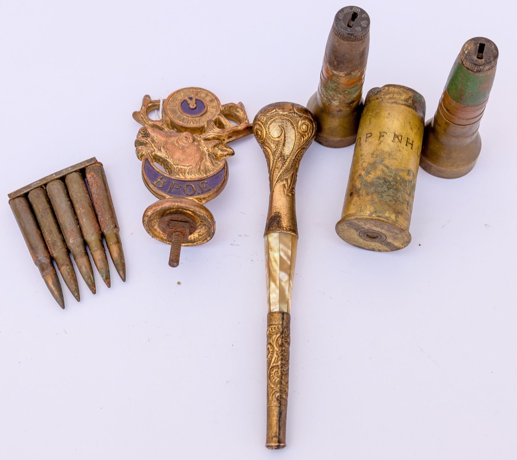 5 bullets in clip, 37mm brass casing, 2x 4" brass/copper items, BPOE emblem, 7.75" handle with mother of pearl?