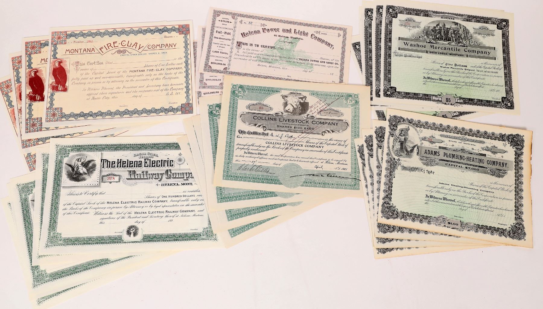 Lot of 29. All but one unissued. Includes: Helena Electric Railway Company (5, 1890s); Montana Fire-Clay Company (5, 1880s, colorful); Helena Power & Light Company (5, 1800s, colorful); Washoe Mercantile Company (5, Deer Lodge, Montana, 1890s); Adams Plumbing-Heating Co. (4); and Collins Livestock Company (4 unissued, 1 issued in 1921, Helena).