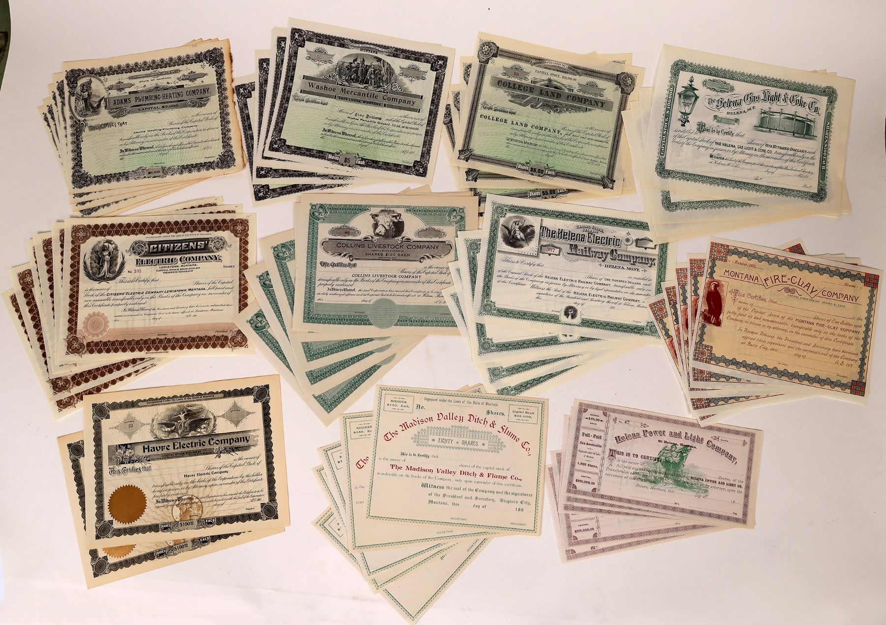 Lot of 60. All unissued. Includes: Helena Electric Railway Company (5, 1890s); Montana Fire-Clay Company (5, 1880s, colorful); Helena Power & Light Company (5, 1800s, colorful); Washoe Mercantile Company (5, Deer Lodge, Montana, 1890s); Adams Plumbing-Heating Co. (5); Havre Electric Co. (2); Helena Gas Light & Coke Co. (5, 1880s, great vignette); College Land Company (Deer Lodge, 1890s, 4); Citizens' Electric Company (Lewistown, 6); Madison Valley Ditch & Flume Co. (Virginia City, 1890s, 8); and Collins Livestock Company (10, Helena).