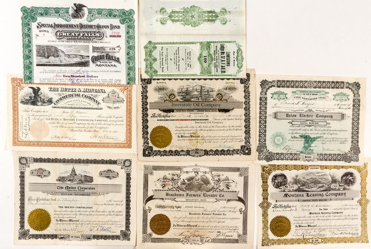 Lot of eight pictorial pieces. Includes: The Butte & Montana Commercial Co. (1893, not cancelled), Broadview Farmers' Elevator Co. (1921, not cancelled), Interstate Oil Co. (1917, not cancelled), Montana Leasing Co. (1930, not cancelled), Union Electric Co. (1908, not cancelled), The Melton Corp. (1928, not cancelled), Lewiston Lodge No. 37, A.F.&A.M. (1909 $100 bond, not cancelled, 3 coupons), and Great Falls Special Improvement District Coupon Bond ($9, 1924, stamp cancelled, 4 coupons). (Prag Collection) City: State: Montana Date: 1893-1930 HWAC# 34477