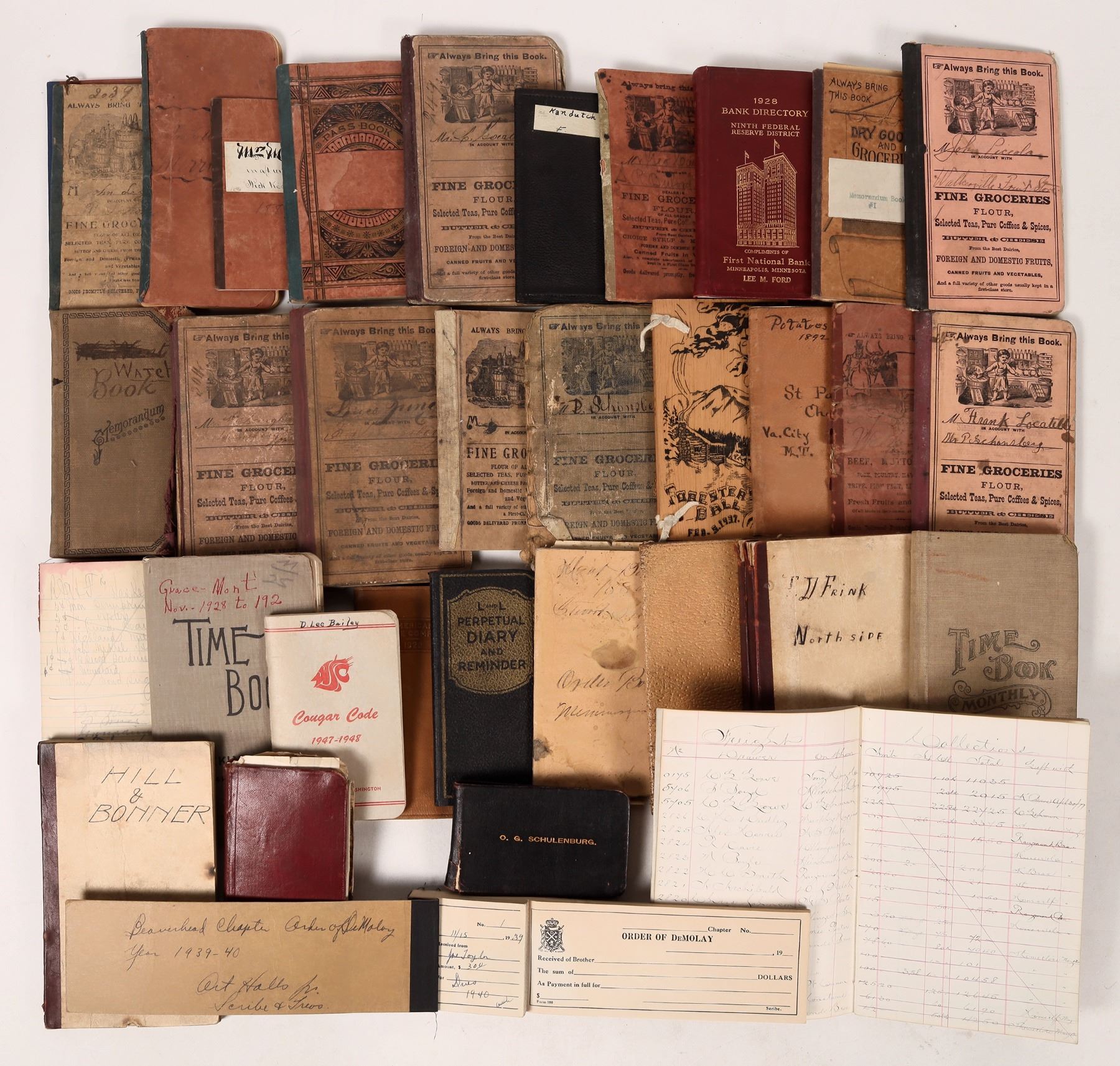 32 vintage Montana notebooks, some with imprinted front covers. See photo.