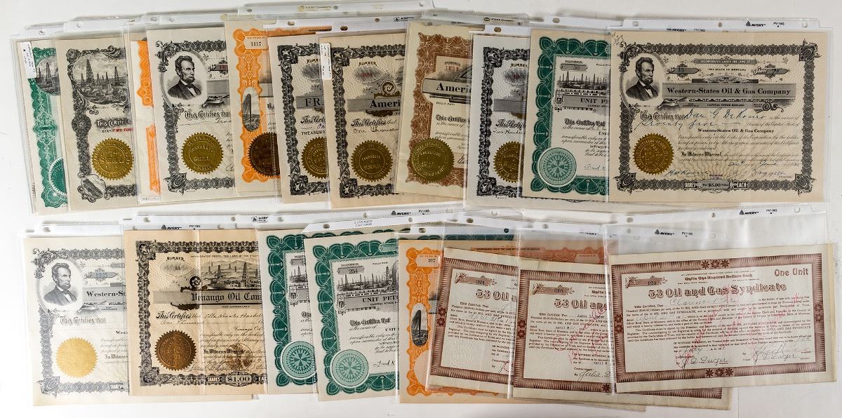 24 stocks include: Denango Oil Co., no. 53, 1000 shares, 1905; National Oil Co., no. 6091, 2000 shares, 1917; American Oil Co., no. 5051, 1000 shares, 1917; Liberty Oil & Gas Company of Montana, no. 2049, 1000 shares, 1918, adhesive revenue stamp; Frannie Oil Co., no. 634, 1000 shares, 1919; Black Magic Oil Co., no. 893, 20 shares, 1922; and more. City: State: Montana Date: ID: 36269