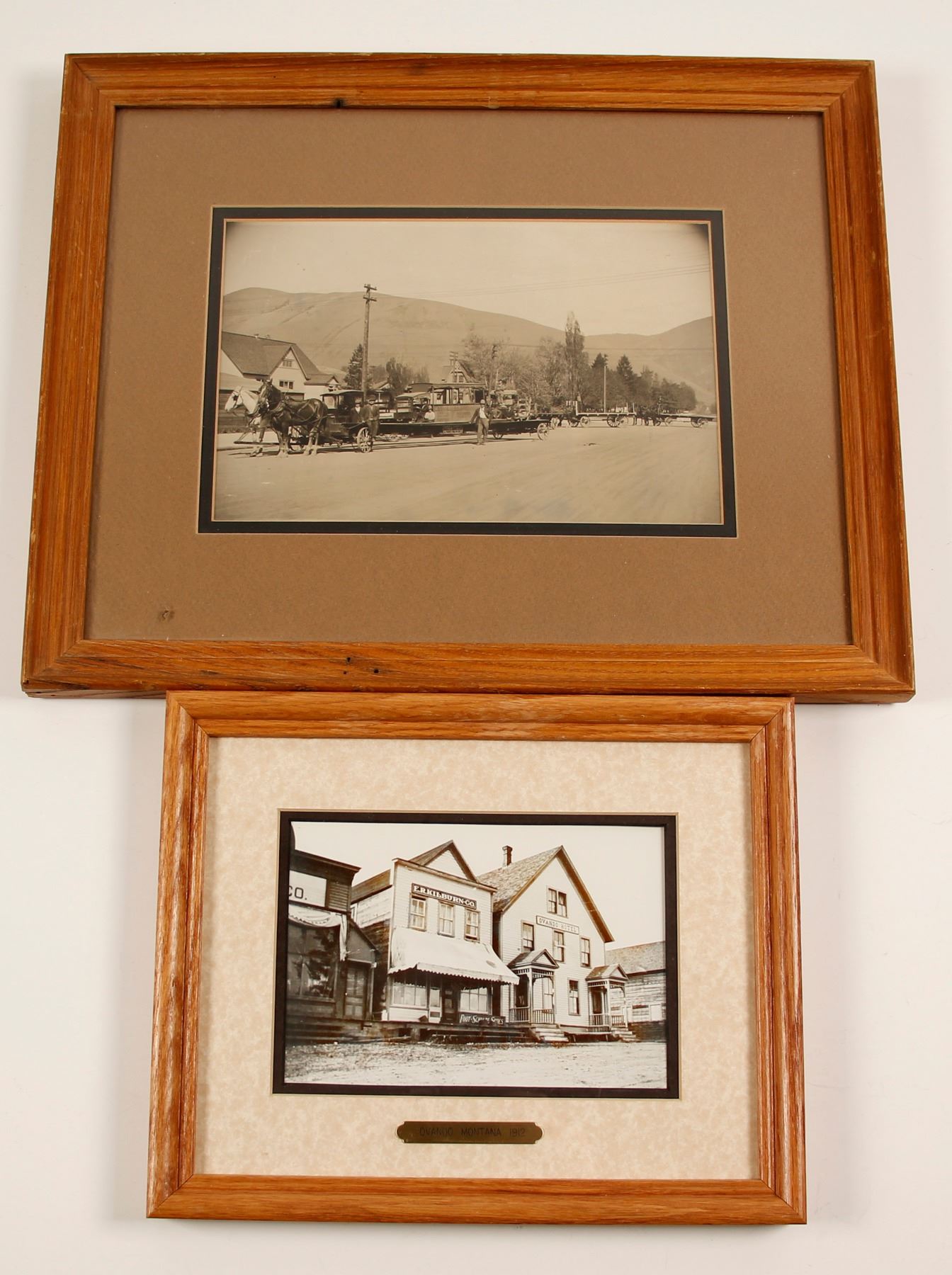 Framed and matted 5x9" photo of a MT town with a horse drawn WL Bailey transit trailer. 4x6" framed and matted repro of Orvando Hotel. City: Ovando State: Montana Date: