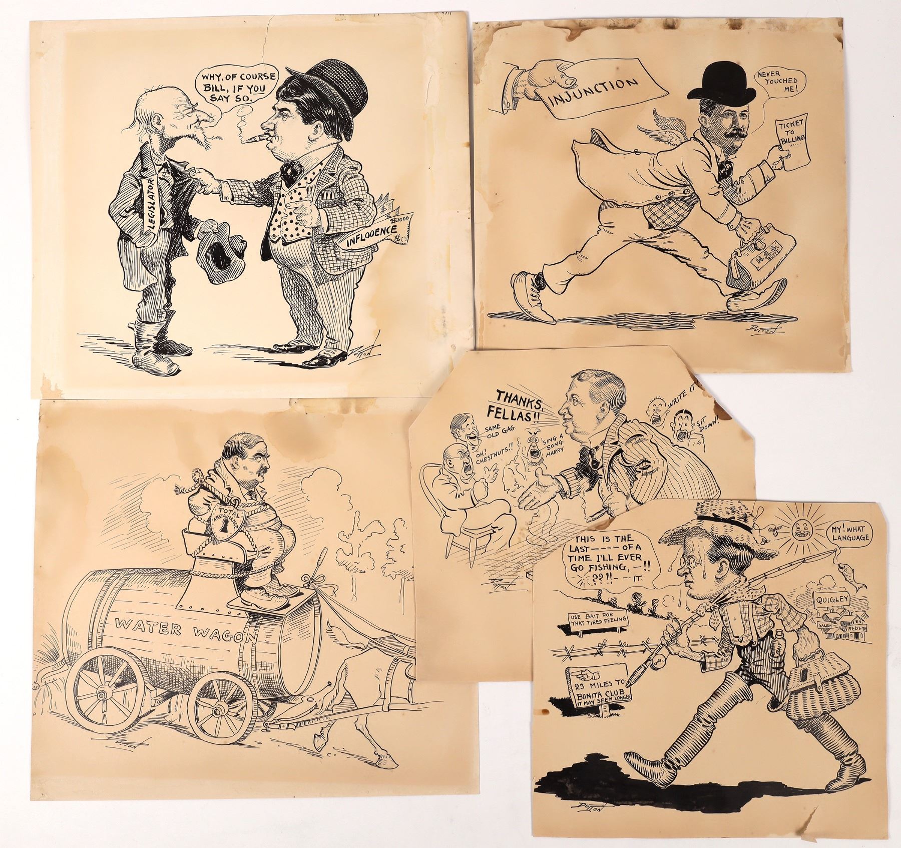5 Montana original art political caricatures by Dutton. Water Wagon, Why of Course Bill, Injunction featuring Harry A Gallwey-General Manager Butte, Anaconda and Pacific Railway, Thanks Fellas!! possibly featuring Harry Hall. Lewis and Clark County state legislator. c. 1911 Bonita Club. 9x9.75" to 10.25 to 10.25". Most have stains, some cut corners, please inspect.