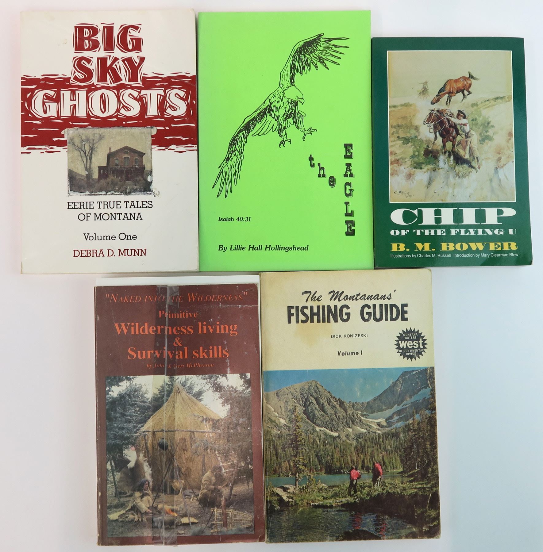 This cache of five books are about Montana living past and present. There is "Primitive Wilderness Lining & Survival Skills" by John and Geri McPherson , paperback, 408pp., poor condition, very well illustrated 1993. "The Montanans' Fishing Guide" vol. 1 by Dick Konizeski , paperback, 1970 signed by the author, 325pp. Good condition. "Big Sky Ghosts" by Debra D. Munn paperback, 1993, a collection of 17 ghost stories in Montana, including the ghosts of the little bighorn battlefield, 139 pp. "The Eagle" by Lillie Hall Hollingshead, paperback, 1976, 155pp. a collection of stories and photos from a century past, autographed by the author., very good condition. "Chip of the Flying U" by B.M. Bower, paperback, 1995, 264 pp. Illustrated by Charles M. Russell, very good condition.