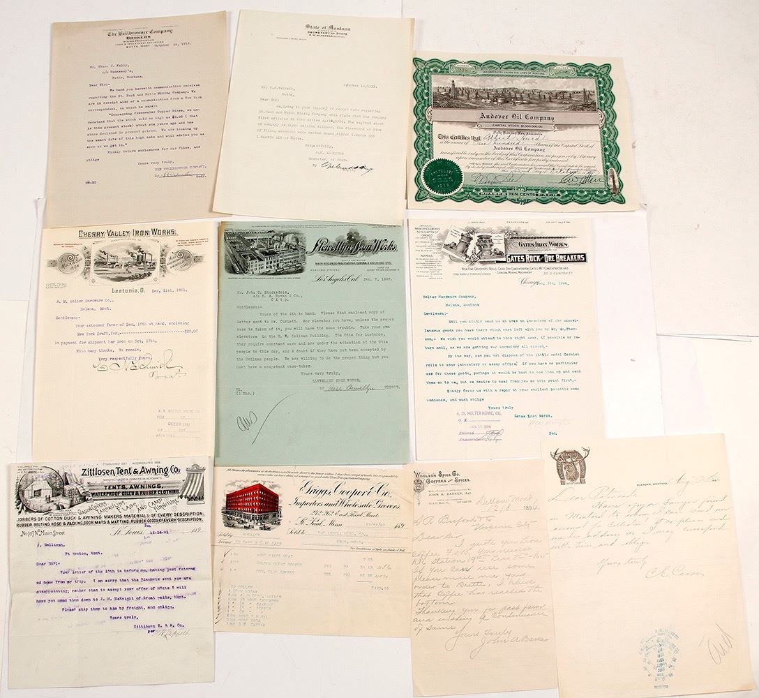 Lot of 10. 1) Stock for Andover Oil Co., inc. in Montana, 1930, not cancelled, large oilfield vignette. 2) Letterheads: pictorial Elkhorn Trading Co., Elkhorn, Montana, 1896; Woolson Spice Co., Dillon, Montana, 1896; pictorial Griggs, Cooper & Co. (Grocers, St. Paul), 1899 to The Isdell Mercantile Co. in Pony, Montana; highly illustrated for Zittlosen Ten & Awning Co. (St. Louis) to J. Sullivan in Ft. Benton, 1891; pictorial for Gate Iron Works, Gates Rock & Ore Breakers, Chicago, 1894, to Holter in Helena; 1913 Heilbronner Co. Brokers, Butte, re: St. Paul & Butte Mining Co.; 1913 Secretary of State letterhead, also re: St. Paul & Butte MC; pictorial for Llewellyn Iron Works (Los Angeles), 1907; and pictorial for Cherry Valley Iron Works (Leetonia), 1891 to Holter in Helena. Date: 1891-1913 Location: Montana HWAC# 55558