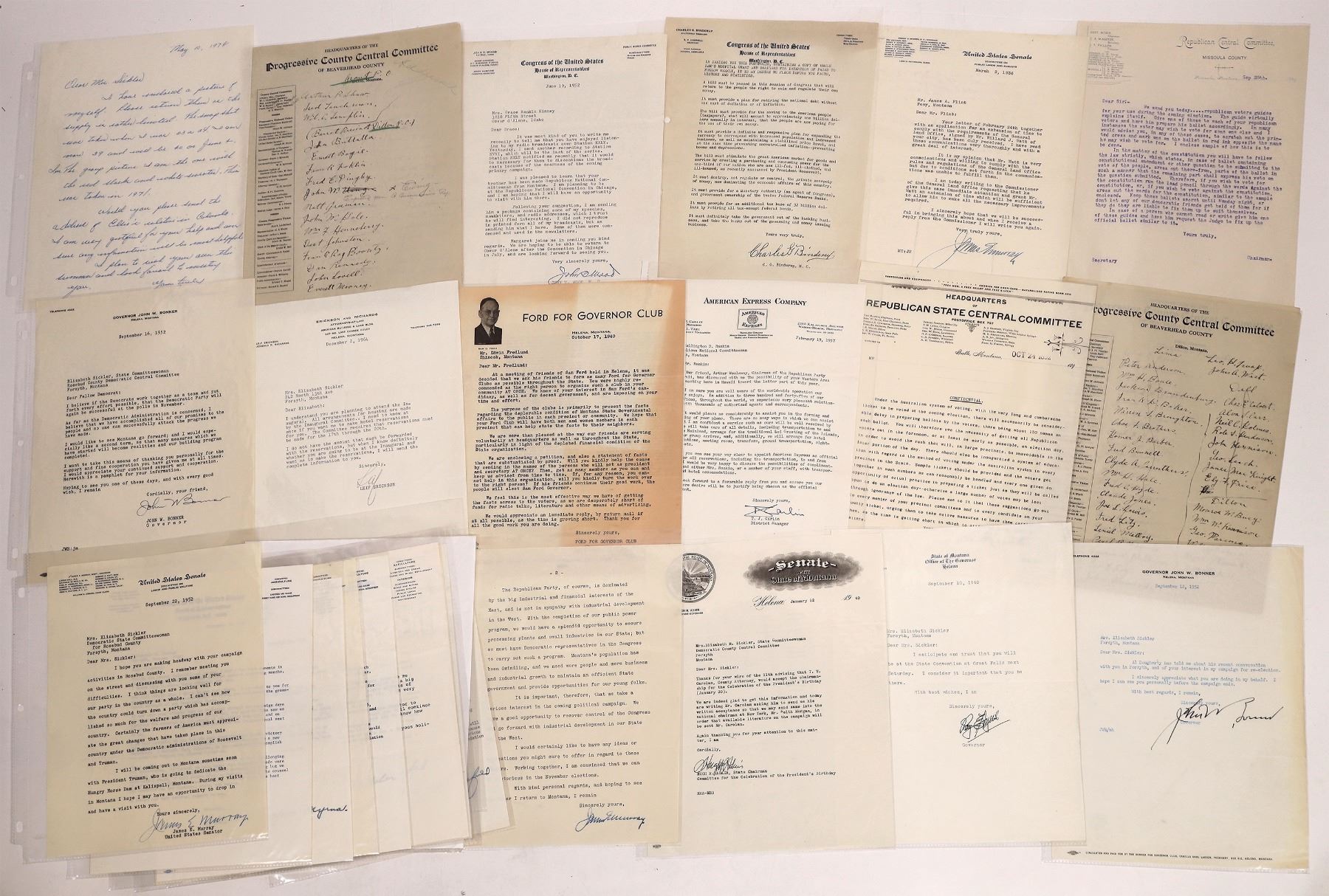 Group of about 30 letters with signatures and autographs from various state and national politicians from Montana and some other states like Nebraska, Idaho, etc. These politicians include James Murray (MT), Charles G. Binderup (NE), John T. Wood (ID), Lee Mantle (MT), Mike Mansfield (MT), John W. Bonner (MT), Roy E. Ayers (MT), John Melcher (MT), and many others. These are mostly letters written to constituents. Most of these letters are from the 1940s-1970s, but some are from as early as the 1890s-1910s. Average size is 8.25x 10.5, good condition. State:Montana City: Date: Provenance: Stuart MacKenzie Montana Collection