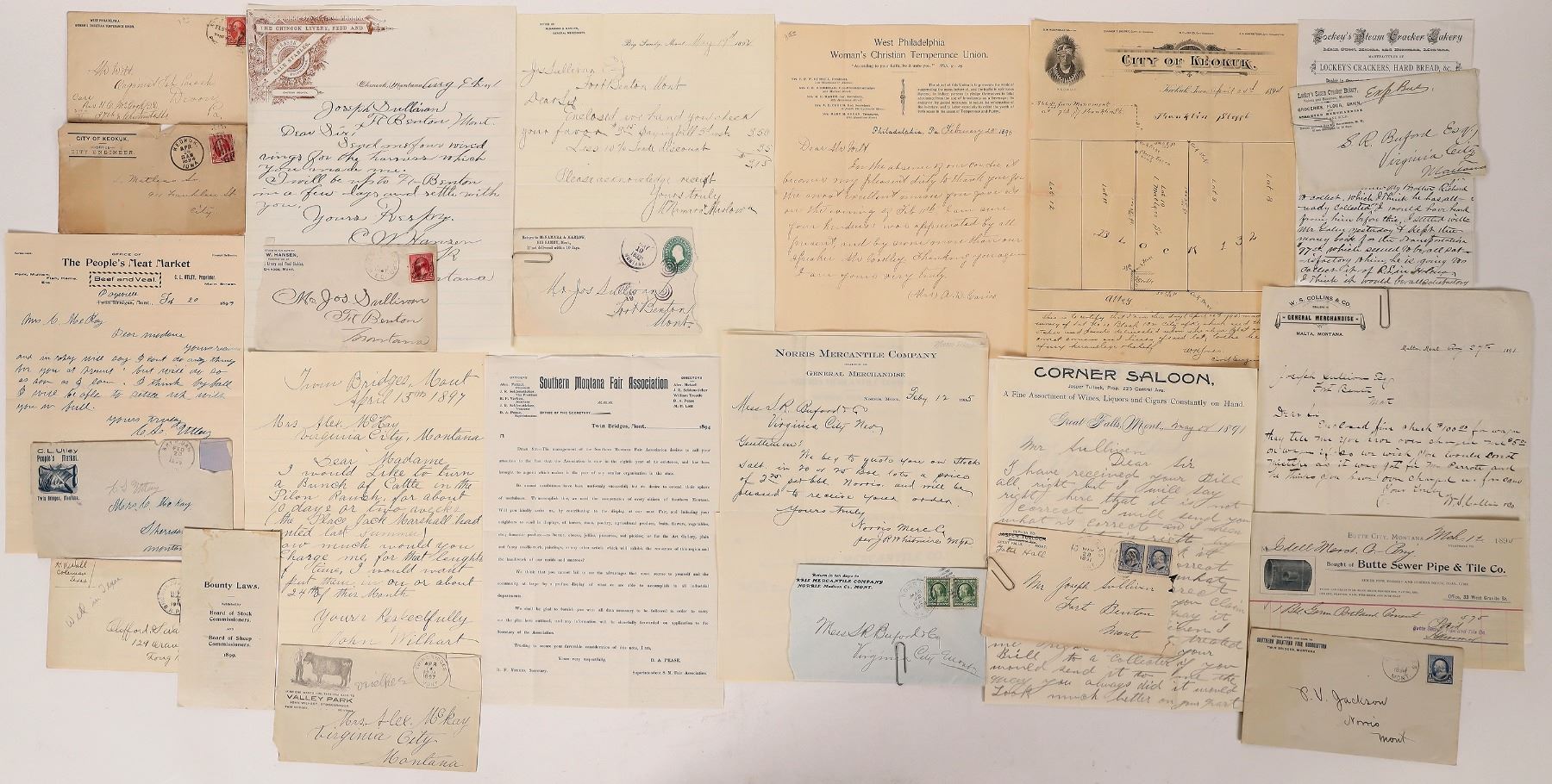 Lot of eleven Montana postal covers with matching letterheads. Chinook Livery, Feed and Stables; McNamara & Marlow, Big Sandy; People's Meat Market, Twin Bridges; Lockey's Crackers, Helena & Bozeman; Corner Saloon, Great Falls and others. Montana