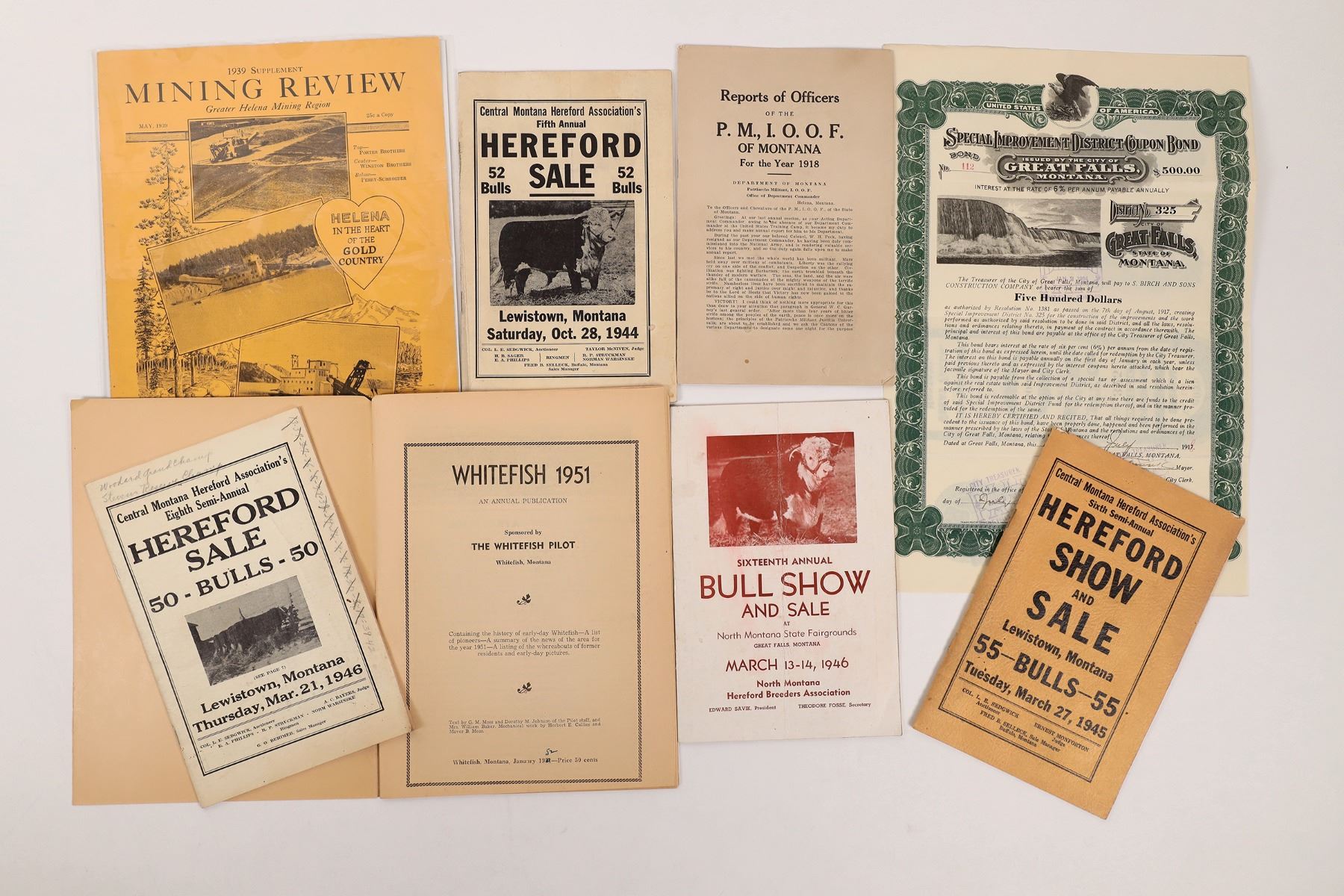 8 Montana publications. Whitefish 1951, 1939 supplement Mining Review, 4x cattle publications 1944-46. Great Falls Special Improvement Bond, 1918 IOOF reports of officers. Montana