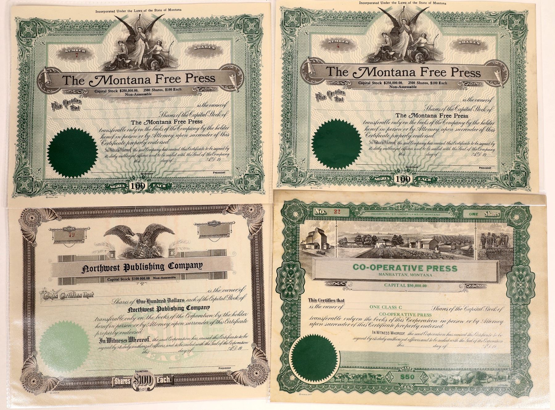 Lot of 4, all unissued. 1) The Montana Free Press. Unissued stocks no. 4 and 7, green border and seal, black print, allegorical vignette. Independent newspaper in Butte, c. 1920s. 2) Co-Operative Press. Manhattan, Montana. Green border and seal, black print, and farming vignettes. 3) Northwest Publishing Company. Black border and print, green seal, and eagle vignette. Published two newspapers in Missoula.