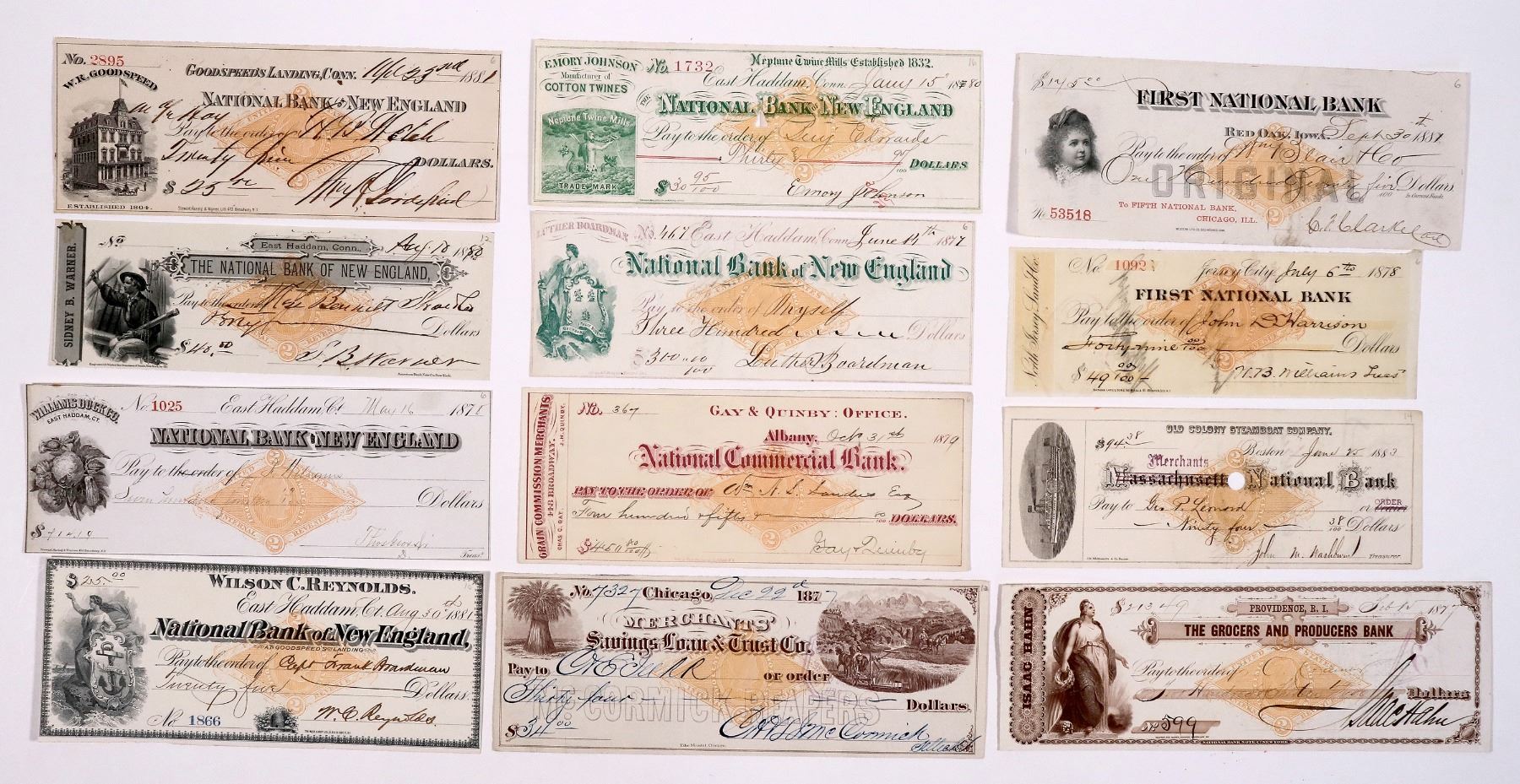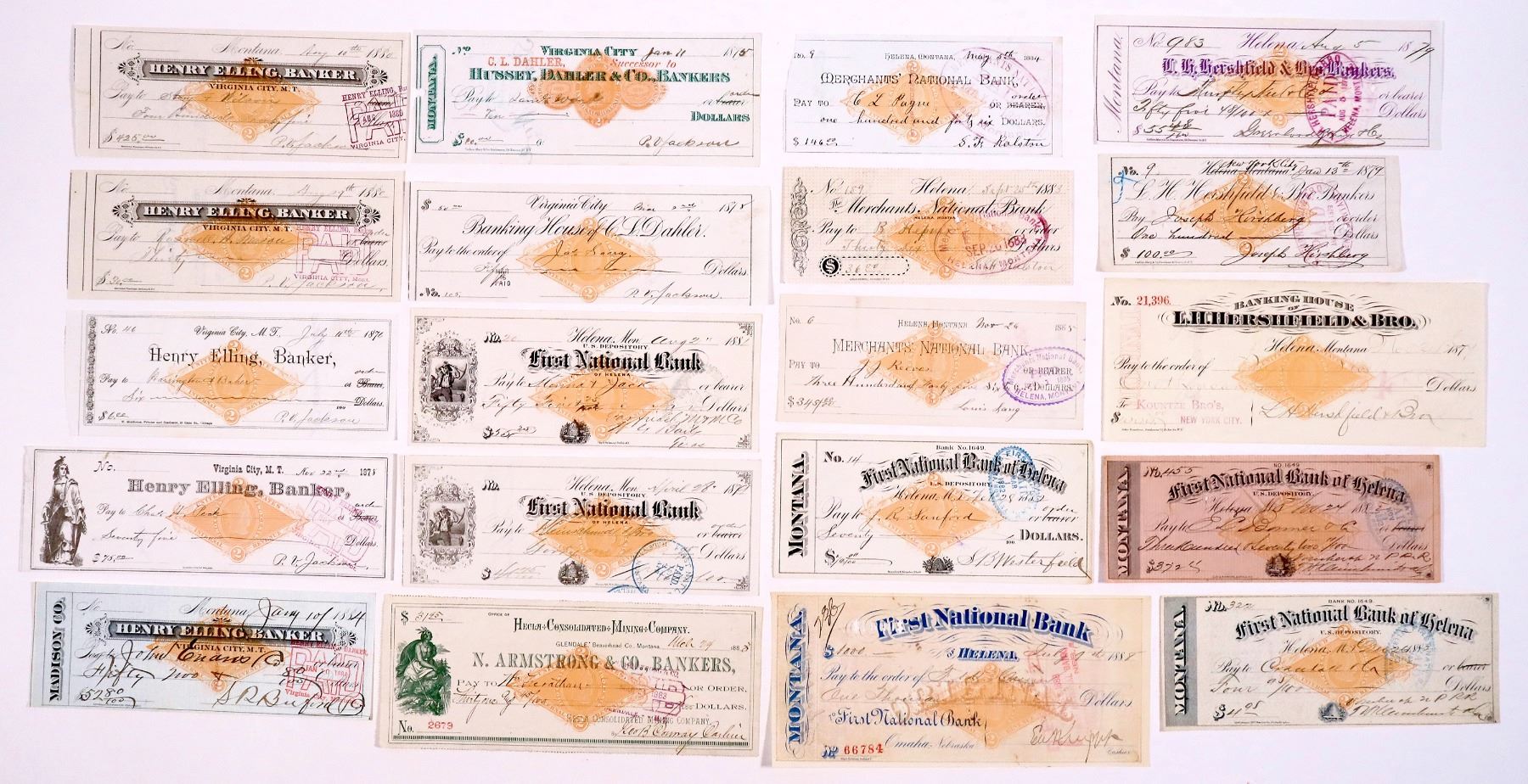 About 30 different Montana RNG checks. c. 1877-88. Nice mix, allegorical and mining vignettes.