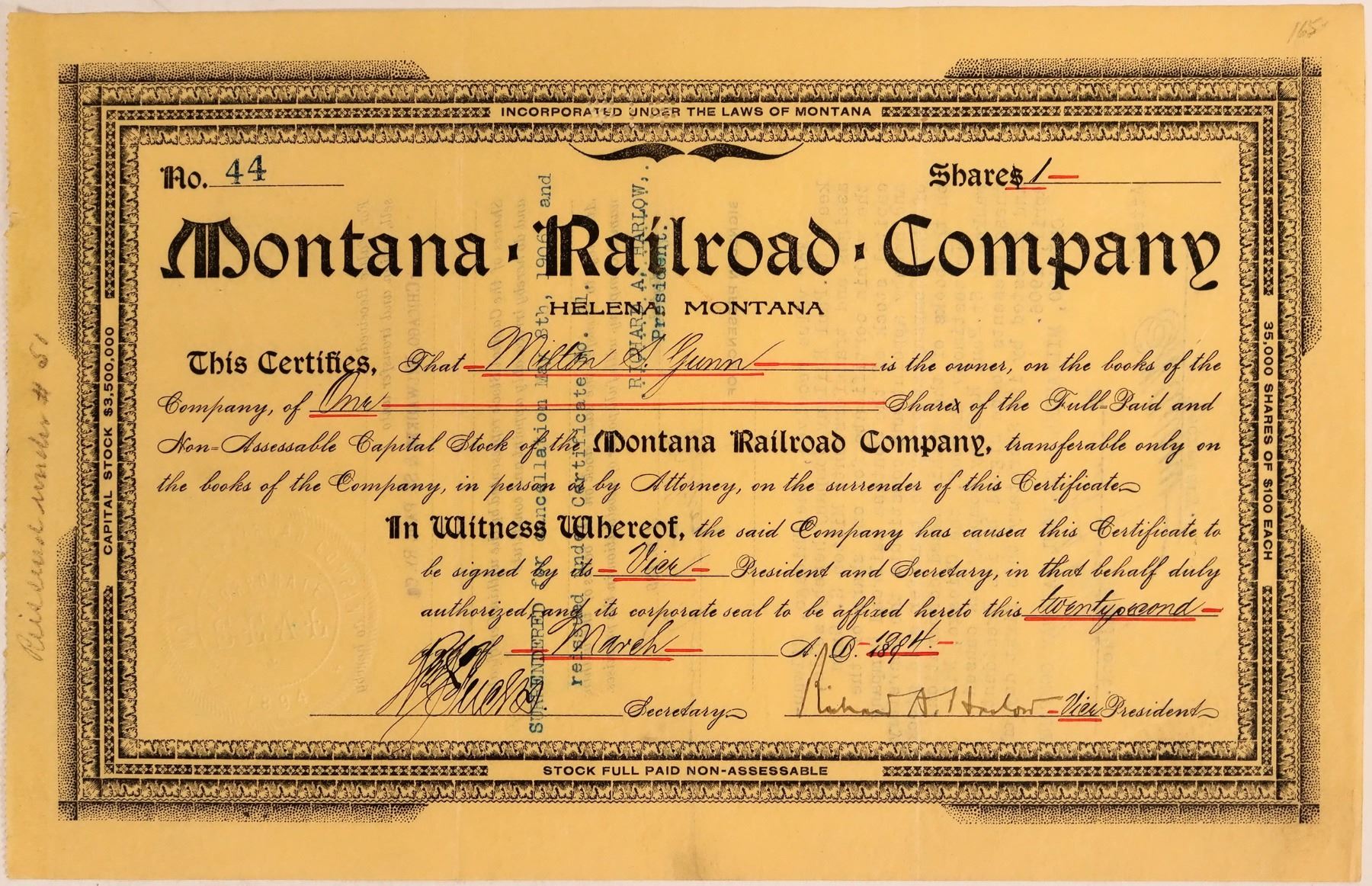 Incorp. 1894 it was an American railroad built and operated between the towns of Lombard and Lewistown, Montana, a distance of approximately 157 miles. The railroad connected with the national railway network via a connection with the Northern Pacific Railway at Lombard. It operated independently until 1908, when it was acquired by the Chicago, Milwaukee, St. Paul and Pacific Railroad ("the Milwaukee Road"). The railroad was colloquially known as "the Jawbone". #44, I/C, One share issued March 22, 1904 (handwritten over dateline 189_) signed. Black on yellow paper, embossed seal, unknown printer. EF