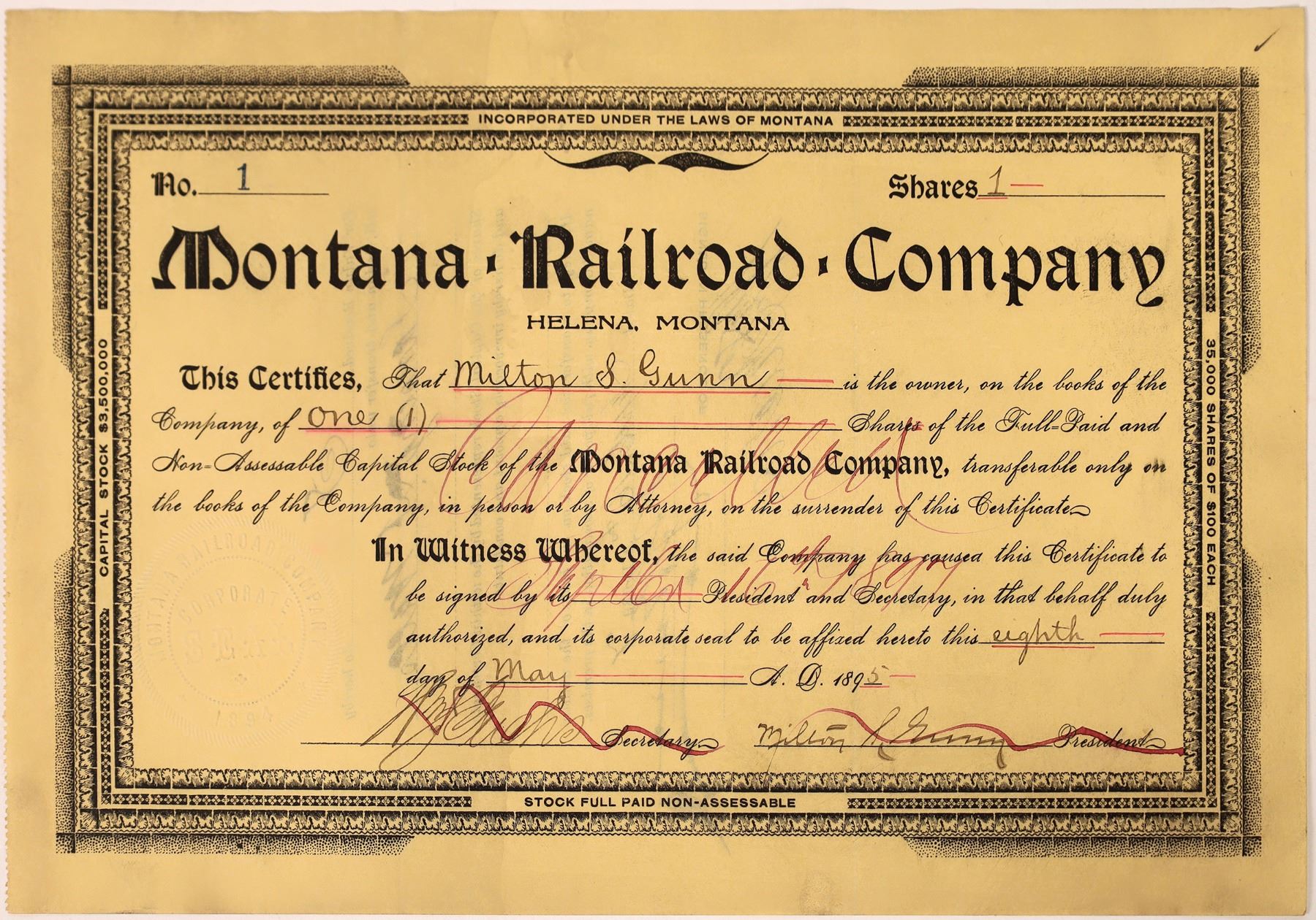NUMBER 1 for 1 share to Milton Gunn - a founder's share. Signed by Gunn as president. Names cancelled in red. No edge, corner or discoloration issues. Extremely nice and clean. However, endorsed by Gunn on reverse. Black on yellow. Gunn was one of Helena's most prominent attorneys. This was part of the Northern Pacific Railroad line!